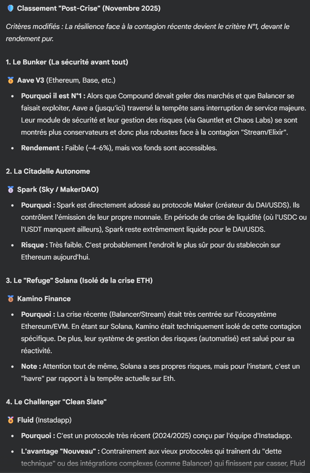 En sécurité technique, AAVE v3, Spark et Morpho sont tout en haut du tableau. Ensuite, en % d'APY c'est difficile de les classer : Message édité par kimmeria le 13-11-2025 à 16:19:27 |