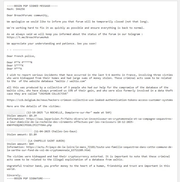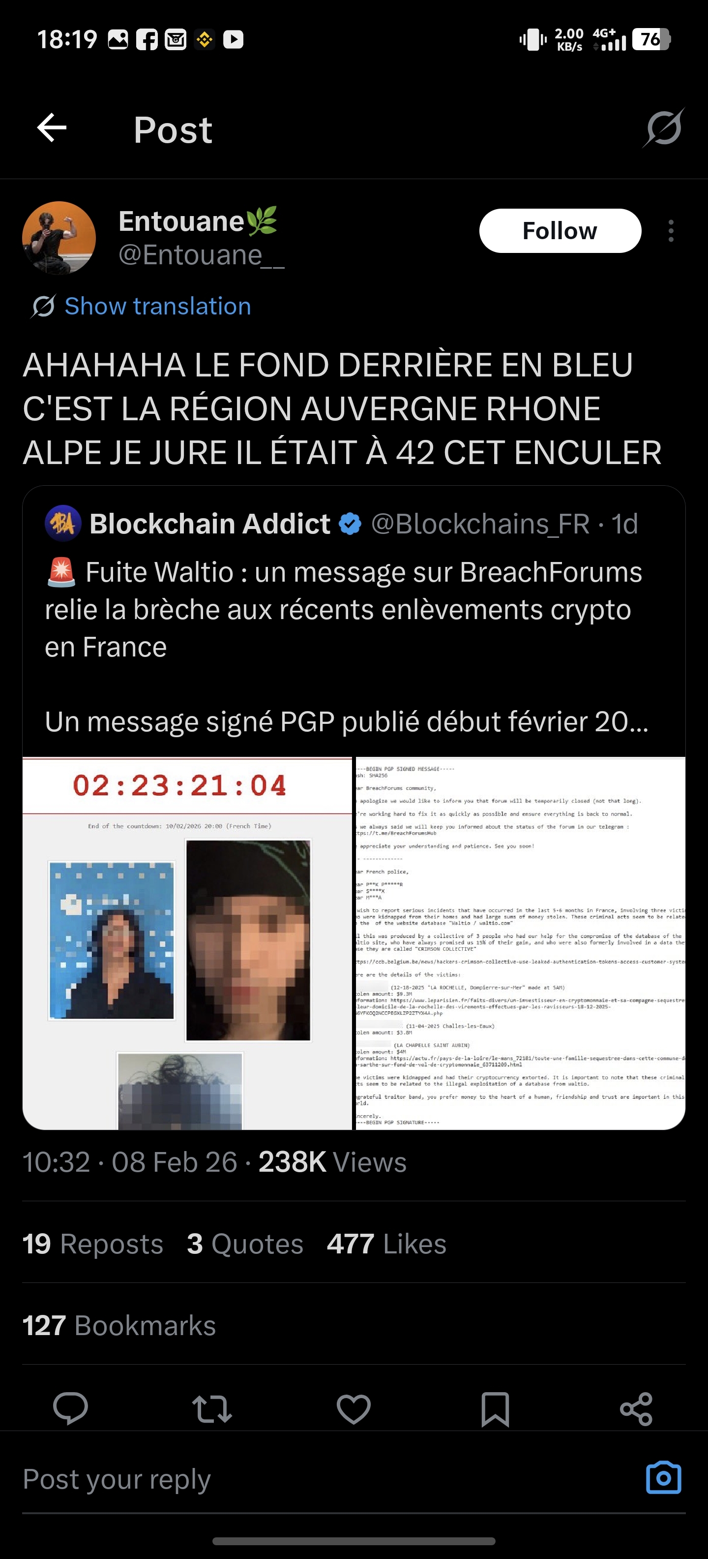 n0name Etat nounou, Etat soeur. | Super nouvelle ils sont en train de choper les "cerveaux" derrière tous les derniers kidnapping FR. Tout part de la fuite Waltio (attention Vincent libre). Le hacker devait toucher 15% des rançon mais ces cons l'ont pas payé. Il a menacé de les dénoncer si pas de paiement avant demain, et dans la menace il a diffusé des images floutées des bandits, mais des mecs ont réussi a retrouver les photos d'origibz et donc l'id des criminels. La police est dessus j'espère juste que suite aux doxing les mecs de sont pas enfuit au Maghreb https://x.com/i/status/2020430650822783487 Message cité 1 fois Message édité par n0name le 09-02-2026 à 16:53:29 --------------- Mes ventes: https://forum.hardware.fr/forum2.ph [...] 851&page=1 |