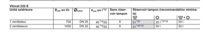 Batman-Fr powered by caféine | J'ai creusé le truc. Le fichier dont tu as tiré l'image est la notice d'étude c'est bien cela ? Après relecture rapide, j'ai dû mal interpréter ton image. L'histoire de l'unité extérieure c'est juste pour déterminer s'il s'agit d'un groupe extérieur avec 1 ou 2 ventilateur et donc déterminer le diamètre des tubes (25 ou 32). Vu qu'il ne semble pas y avoir mention de ce genre de détail ailleurs, je suppose donc que tu parlais bien du tube qui relie la PAC à la nourrice... Mea culpa Il a bien un ballon tampon dans sa PAC donc la vanne de décharge n'est pas nécessaire normalement... --------------- Tout ou rien mais rien que tout ! feed-back : http://forum.hardware.fr/forum2.ph [...] ost=121391 |