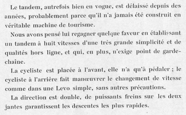 Les solutions technique de cette époque sont assez géniale. On était encore aux débuts et ça innovait dans tous les sens. Dans le catalogue de 1909, il y a une levocyclette. Un système de pédalier à levier crantés pour changer de vitesse : https://www.youtube.com/watch?v=cStspiKFZIc Mention spéciale au tandem "Levo" de tourisme spécial couple ou Madame occupe la position avant où, dixit le catalogue, "elle n'a qu'à pédaler". edit : une autre vidéo (polonaise ?) où on voit le systéme un peu mieux : https://www.youtube.com/watch?v=D8ZdBzKAAiY Message cité 1 fois Message édité par rakame le 06-11-2023 à 15:23:26 |
