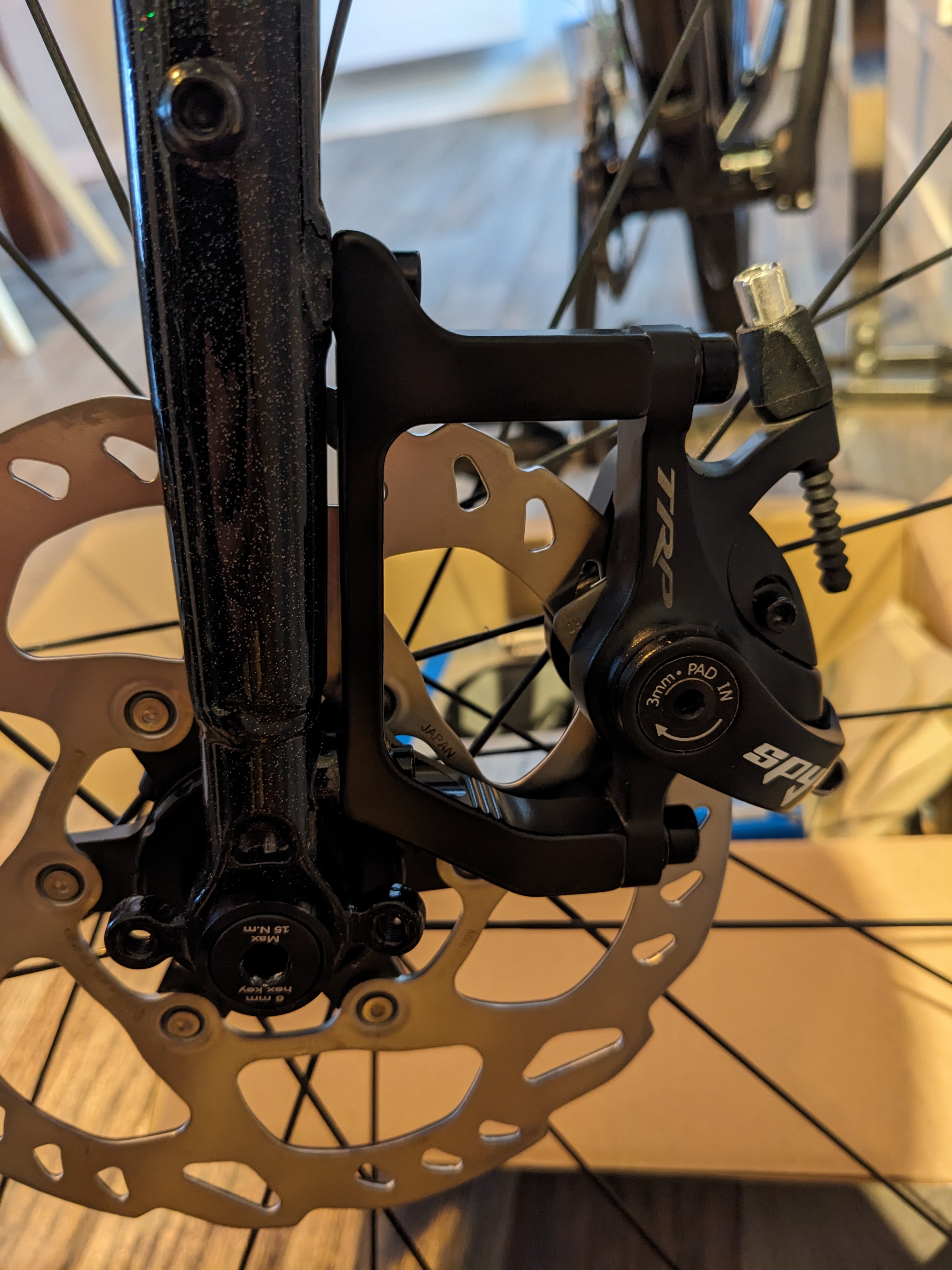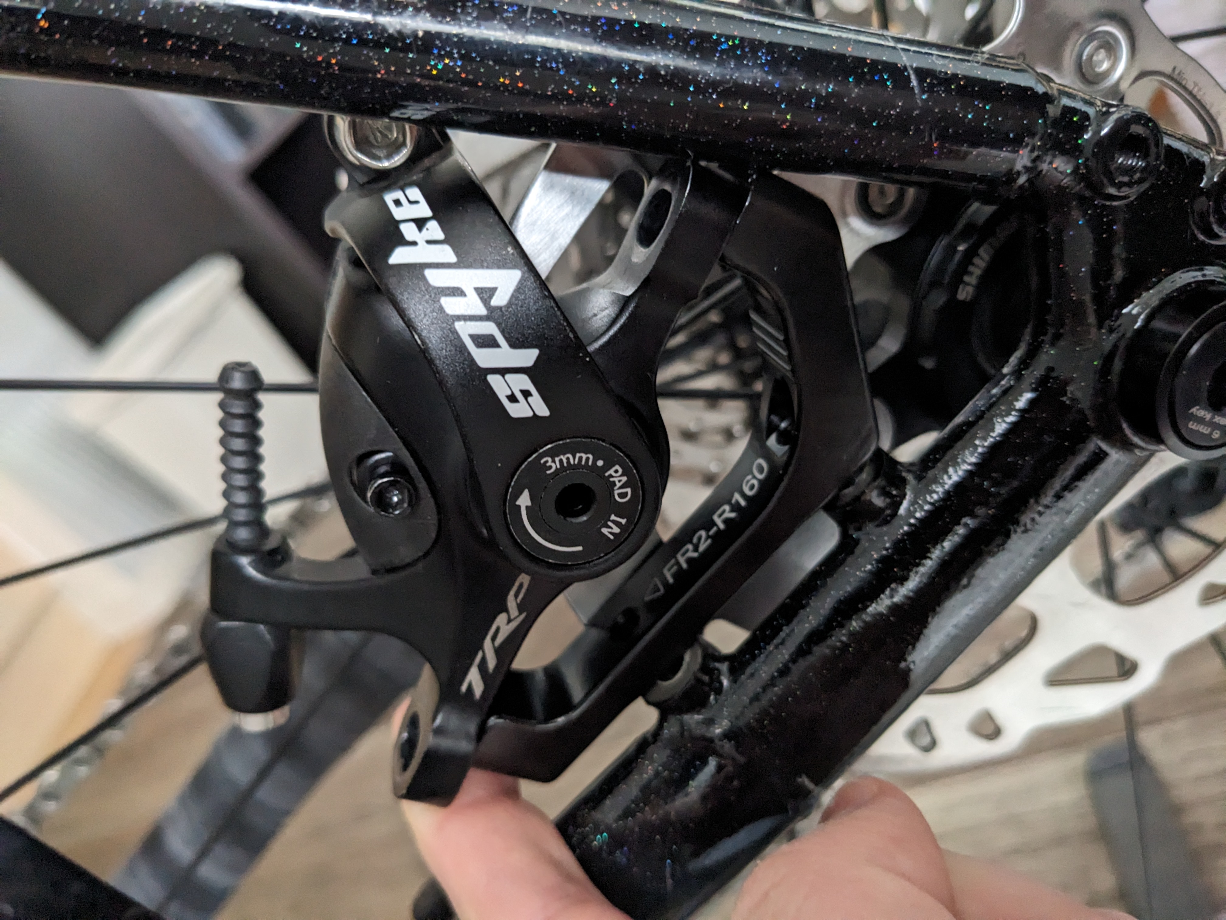 Trotamundos | On est d'accord que ça ne passera jamais J'ai plus qu'à acheter un étrier en flat mount et l'adaptateur 140 -> 160 mm... Dommage, à l'avant c'est nickel. |