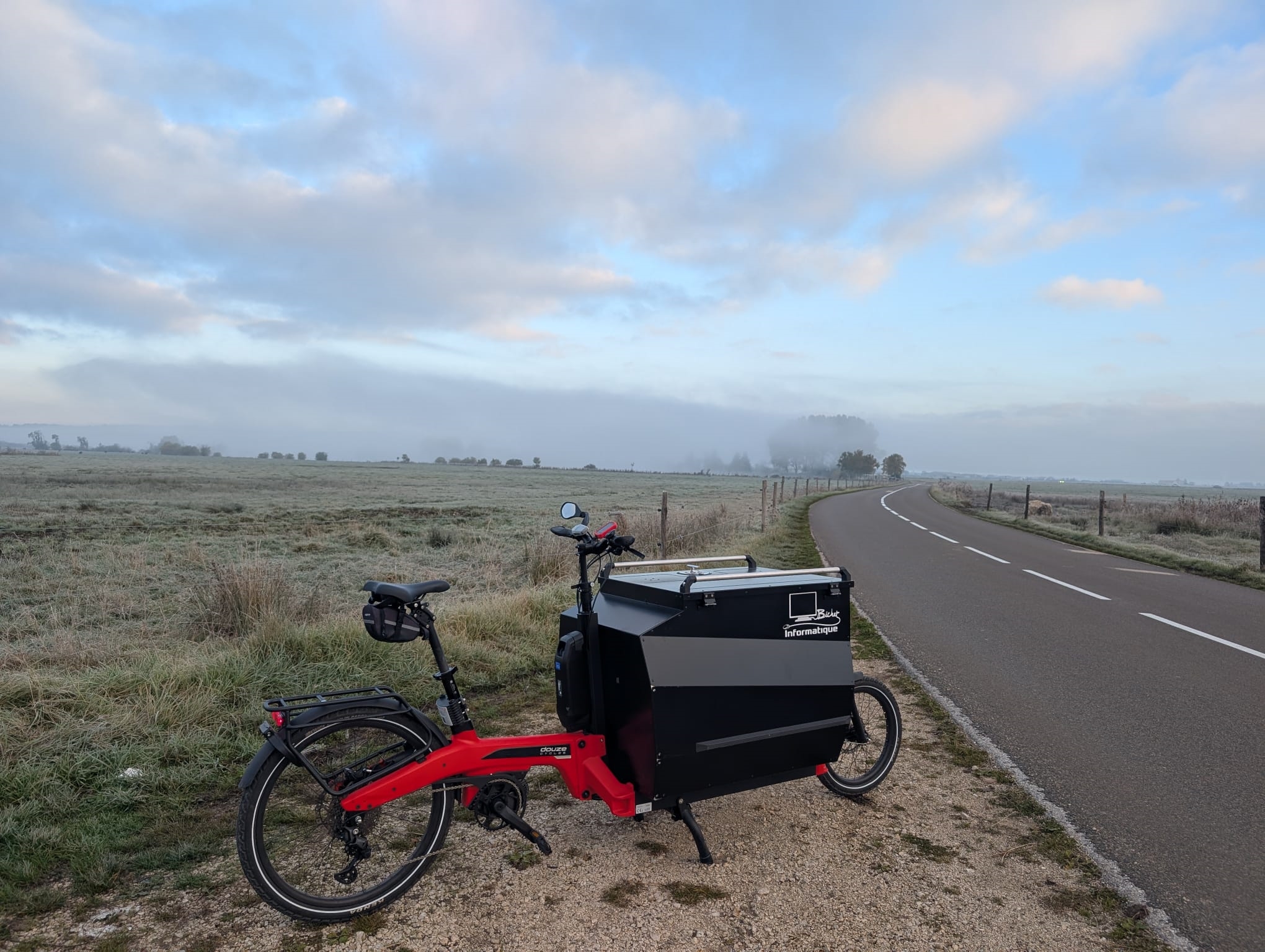 johnclaude You know nothing johnclaude | Petite livraison du matin entre 0 et 2 degrés à 8h. En t-shirt+veste à capuche pas très chaude j'étais bien. Je suis passé par une route de campagne déserte plutôt que la nationale c'était quand meme bien plaisant. Le cache cou Decathlon en merino et les gants windstopper specialized et le casque abus avec cache oreilles c'était parfait.