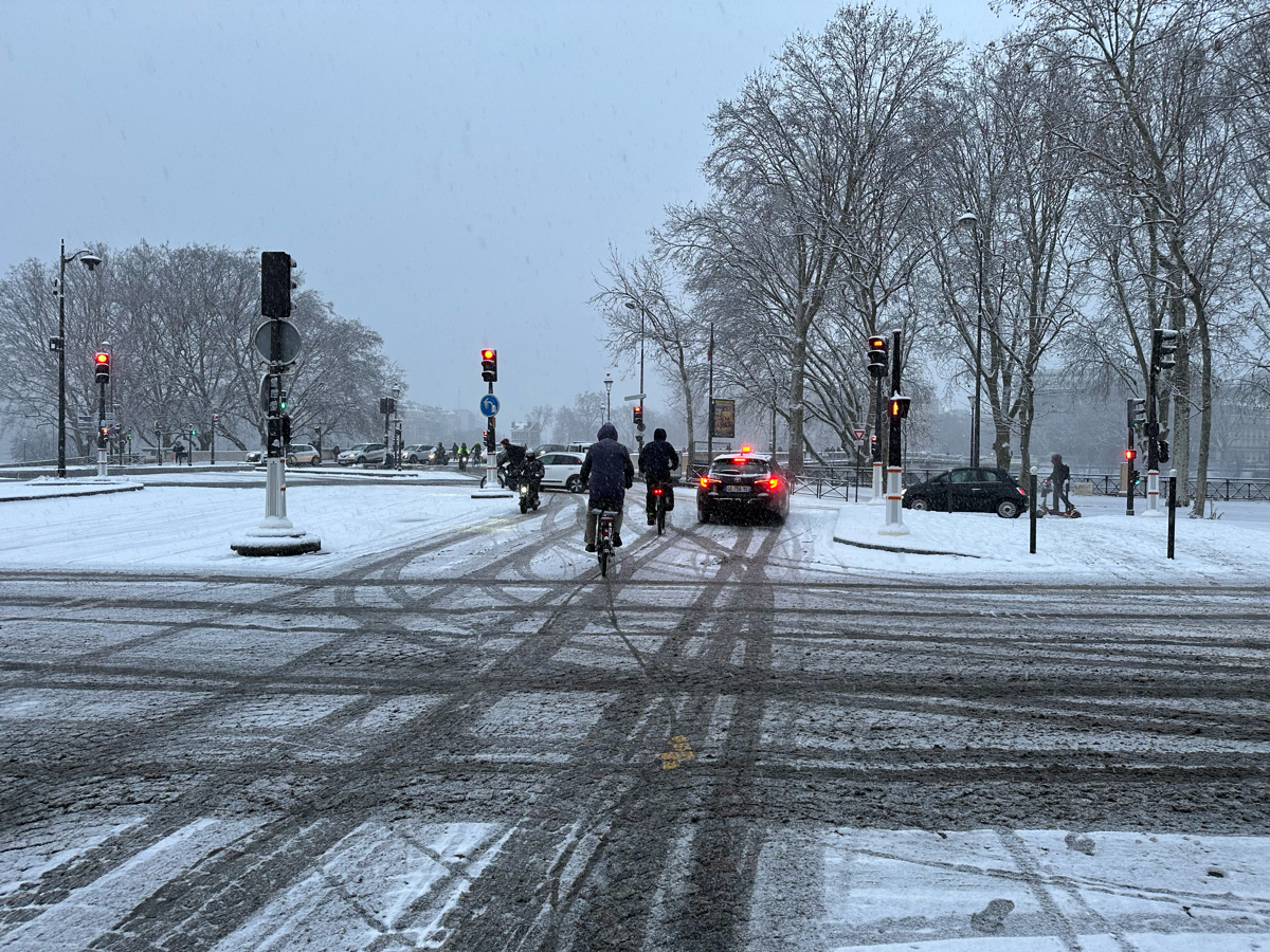 sundae cent | J'espère que les routes vont être salées dans la nuit. C'était un peu tendu la banlieue un peu éloignée vers 18h, je me suis fait avoir par une petite couche de glace en léger dévers, pas de bobo heureusement. J'ai été un peu idiot de faire de l'interfile, même à 10 à l'heure max entre les voitures à l'arrêt. |