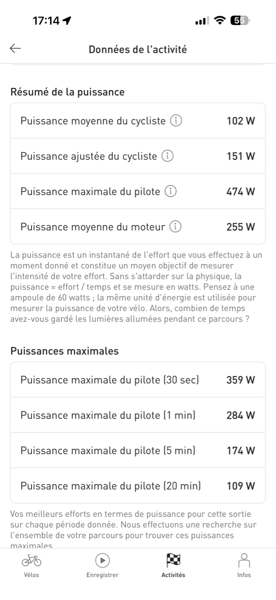 L'énergie c'est l'énergie : qu'on l'appelle cinétique, potentielle, gravitaire ou nucléaire c'est exactement la même chose Tu déplaces 100kg à 23km/h ça demande une quantité d'énergie qu'on peut calculer de différente manière mais qui sera toujours identique (aux approximations près). La différence c'est combien d'énergie initiale il nous aura fallu pour atteindre cette énergie finale/utilisable. Et ça clairement c'est ce qui va expliquer nos différences de calcul. Je n'ai aucune idée des rendements et pertes entre l'effort musculaire, le.moteur électrique converti en couple mécanique pour l'assistance, etc. À priori c'est visiblement pas terrible. Mais c'est toujours plus intéressant que la marche à pied