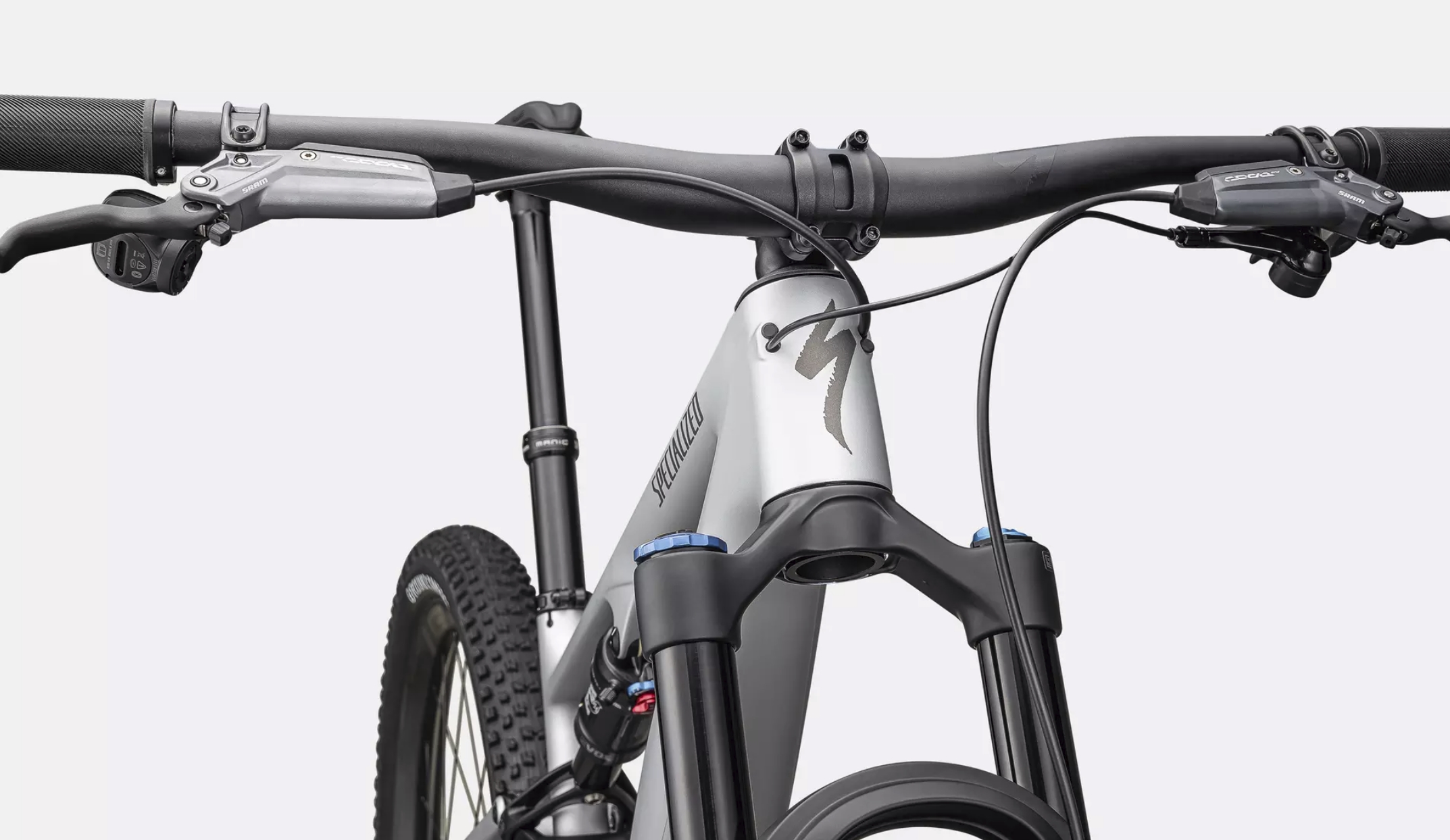 sur nos Epic 8 Evo les gaines ressortent par l'avant du tube de direction :