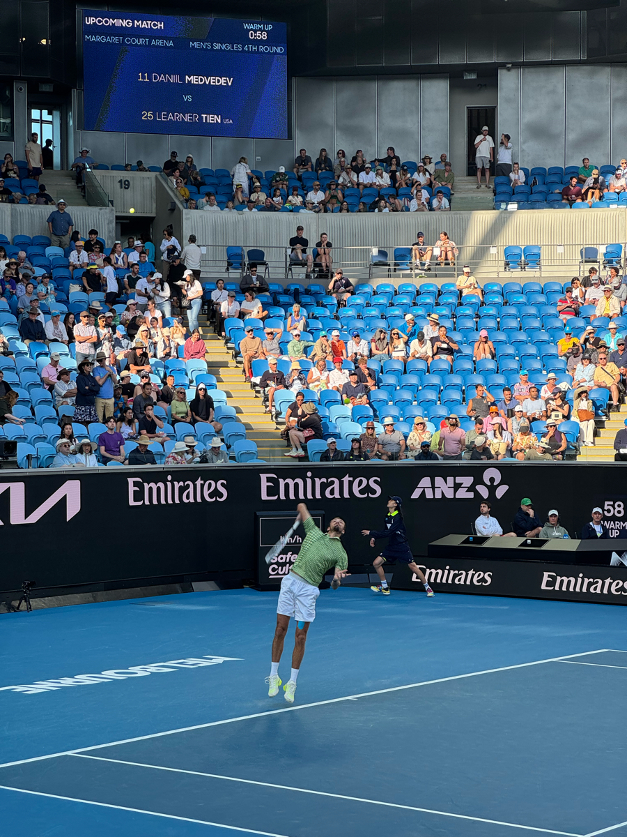 Medvedev Thien qui va commencer. Medvedev fait vraiment crevette par rapport a la plupart des autres joueurs a la fois sur le haut et le bas du corps