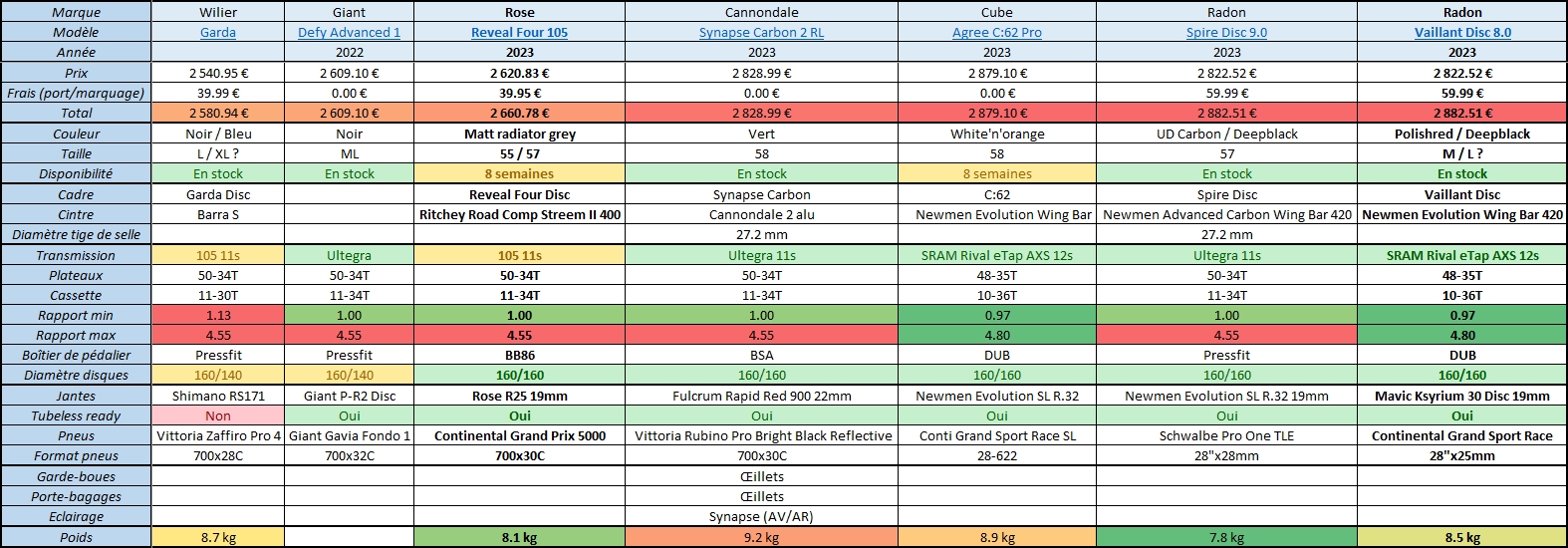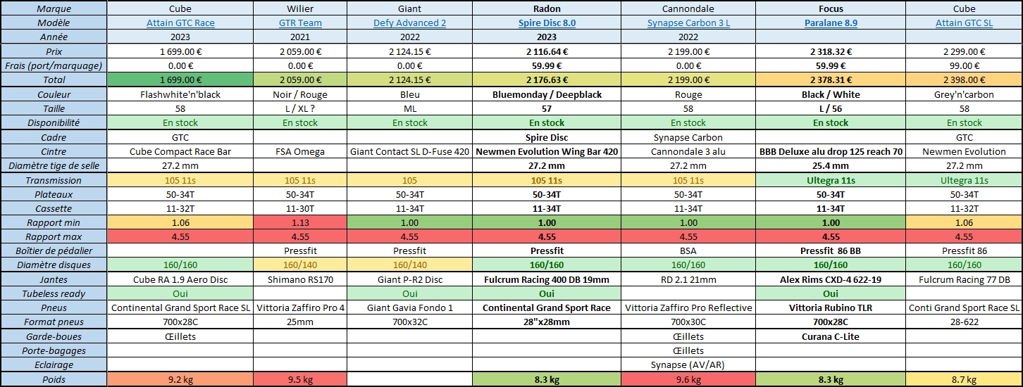 Un peu à part les Cannondale Synapse, bien plus lourds mais qui ont l'avantage d'avoir le système radar+lumières sur batterie (toujours utile en sortie route) et œillets pour pouvoir ajouter garde-boues et porte-bagages si besoin pour m'en servir en tant que vélotaf de temps à autre. Toutefois pas le but premier recherché, le gravel fait très bien ça pour le moment, ici ça serait du bonus. Si vous avez un avis sur ce système Synapse ça m'intéresse |