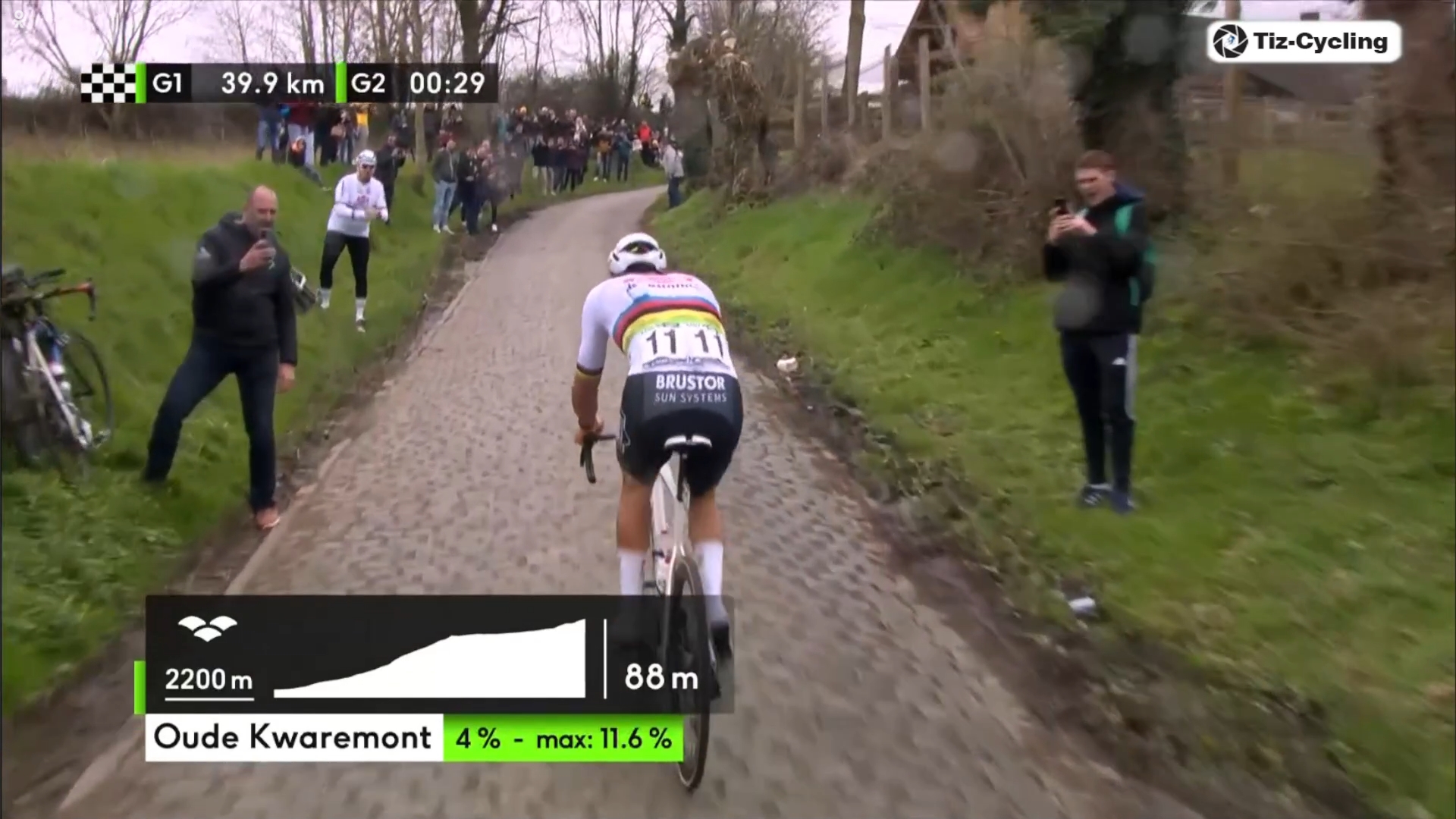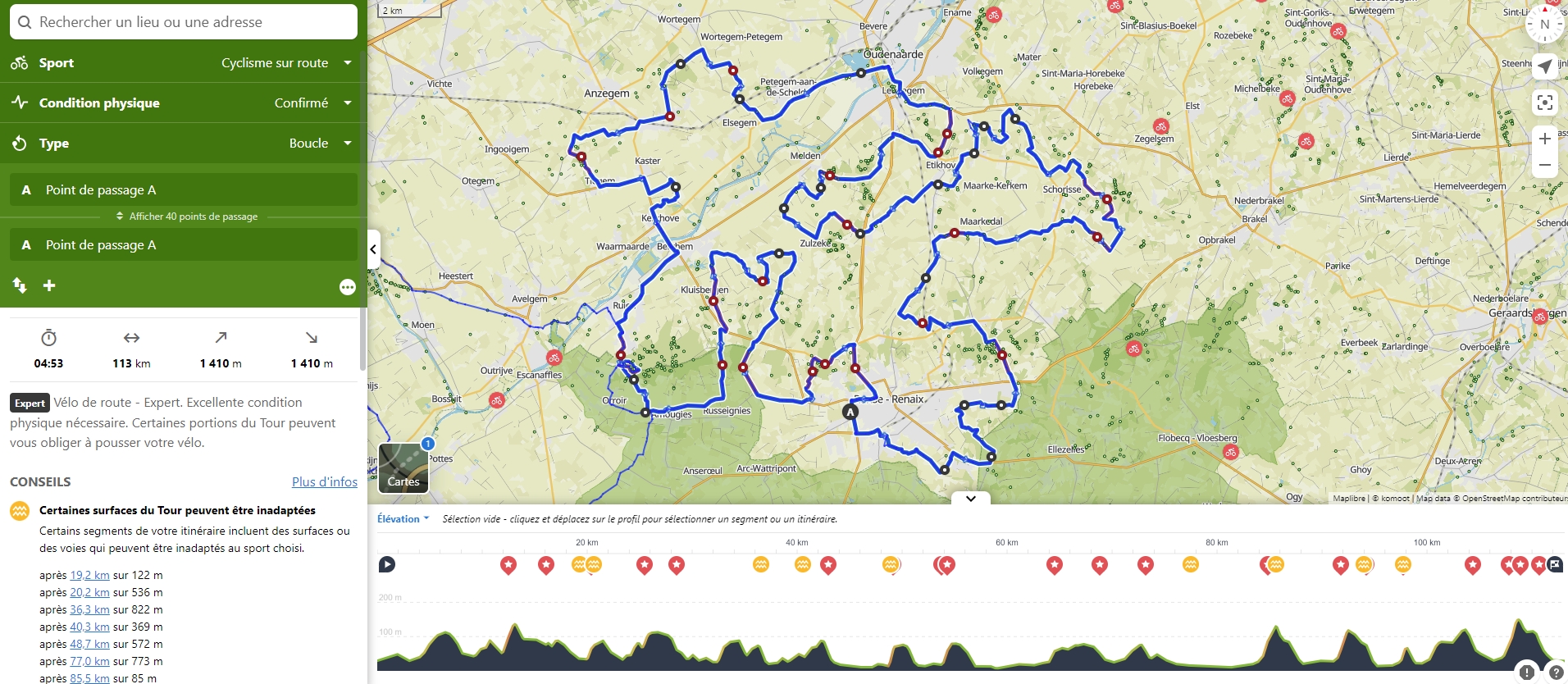 petit retour de ma sortie d'hier, en prépa pour le Ronde cyclo de samedi j'avais préparé le parcours sur Komoot, en essayant de passer par quasi tous les bergs autour de Oudenaarde Passage par le Koppenberg après une cinquantaine de km, un gars devant moi, ne tient pas et met pied à terre, j'arrive à continuer un peu plus, mais c'est beaucoup trop glissant les bergs s'enchainent ensuite entre alternance de soleil / pluie sur fond de rafales à +60km/h j'arrive vers le vieux Kwaremont, malheureusement Komoot a fait de la merde et je me retrouve à le descendre plutôt qu'à le remonter, tant pis à ce moment sur le gps je voit qu'il reste deux grosses montées avec avant un petit pic qui a pas l'air méchant les deux derniers seront faits dans la douleur mais content d'en finir
