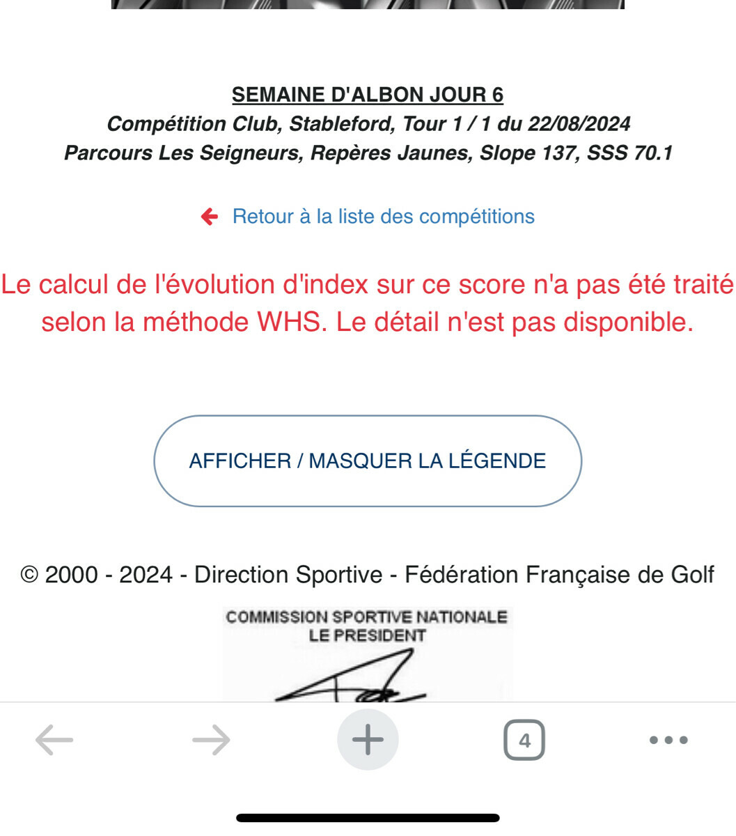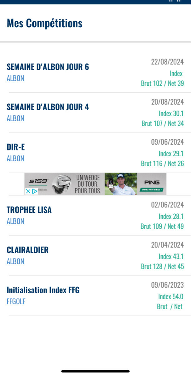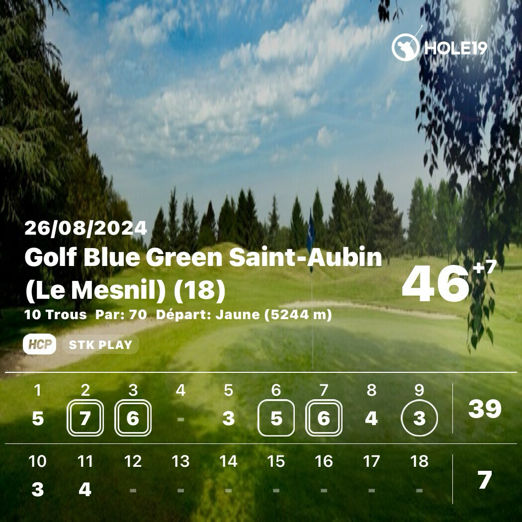 flopshot Never up, never in | Déjà, faut que je sorte ma tête de mon cul Des jaunes, en net, ça fait que mon adversaire me rend une valise de CR. C'est pas tout à fait fair, mais en Brut, ça ne le serait pas du tout. Il a 1 CR des jaunes, j'en ai 11, ça fera donc 8 CR pour moi (au 3/4 de la diff). A sa défaveur, il est jeune papa, et joue donc beaucoup moins souvent. En revanche, ça doit faire 20 ans qu'il joue (depuis ses 10 ans), et il a un index très bas depuis un bail. Pour le choix de la rencontre, nous nous étions arrêtés sur ce matin, à 08h20. Or, je suis pas du tout matinal. Je joue toujours mieux en fin de journée. Et pis pas de bol pour nous deux, la météo a fait chuter la température de pas loin de 15 degrés comparativement à la veille, avec pas mal de flotte tombée durant la nuit. J'arrive pour une fois, pas trop tard, mais ça me laisse juste le temps de faire 5 putts et demi, un demi-seau, et d'acheter des balles, mes derniers parcours m'ayant asséché de ce côté-là. C'est a minima, mais faudra faire avec. Les sensations au practice sont pas dingues, ça arrose un peu partout. Pour la bonne compréhension du parcours, je vous mets le lien du livret de parcours (puisque la page internet décrivant trou par tour a disparu Trou 1 (par 4 très compliqué, du dévers dans les deux sens, d'abord descente puis montée, avec des obstacles pour le drive ET pour l'attaque de green ... un monstre, mais j'ai un CR) : je mets en jeu en premier, avec un gros fade, presque slice, dans l'extérieur du virage à droite. Lui, il prend son drive, et fait un draw/hook ... je m'inquiète d'une possible balle à l'eau pour lui, mais il a l'air serein. Et pour cause, des jaunes, il carry l'eau toute l'année ... il se met donc dans le rough en contrebas de la colline, avec un petit PW à taper. Pour moi, c'est plutôt ... bah je sais pas. Ma pile de télémètre juge opportun de me lâcher dès ce premier trou. Même mon matos n'est pas du matin ! J'y vais au feeling, au F6, et je le tape presque correctement, sauf que ça pushe un peu, et se met dans les chachis à droite du trou. Un peu au même endroit qu'au Championnat, d'ailleurs, avec un mât similaire. Lui, à son deuxième, crie un peu pour que sa balle tombe vite, car il craint de finir derrière ... mais non, ça bloque à moins de 2m du mât. Mouais, ça va être compliqué. Comme au Championnat, je merdasse la sortie de ce chip en pente, balle plus haute que les pieds, et pris dans des hautes herbes. Bref, rien d'étonnant. Sauf que contrairement au Championnat, le chip à suivre ne boîte pas, et même, me mets assez loin du trou. Donc mon putt suivant ne rentre pas, et ça fait double bogey. Lui, rate birdie, mais me crucifie d'un par très solide. 1 Down Trou 2 (par 3 en fort descente, et avec plein d'eau .... on continue dans la non-simplicité) : il met en jeu un PW, je crois, mais ça finit tout début du green, assez loin du mât. Ca m'étonne de sa part d'avoir joué si court. Erreur de contact ou de club ? Ou simple prudence avec toute cette eau autour ? J'y vais au F7 et me met plus proche, mais encore à 7 ou 8m. Nos deux putts sont corrects, moi plus proche que lui. Grand seigneur, il me donne mon putt. Mais il ne tremble pas non plus pour rentrer son 4-footer. 1 Down Trou 3 (par 4 en fort dogleg gauche) : il tape un F3 avec son draw naturel, et ça passe largement la crête pour rouler ensuite pas mal sur le plateau du FW. Mon drive semble vraiment bon, et objectivement, il l'est selon mes standards. Sauf que quand on arrive à nos balles, il n'y a que 20m d'écart entre nos deux balles ... gloups ! Son attaque de green est à la bonne profondeur, juste un peu à gauche, pour lui laisser un putt pas facile à négocier en descente. Mon deuxième coup est bien trop court, mais raté du bon côté, il rebondit pile comme il faut de droite à gauche pour se mettre à moins de 3m du mât, en dessous. Son premier putt est à nouveau très long, et en blaguant, je lui dis que je vais lui épargner la peine de rentrer le putt de retour en rentrant mon birdie. Fanfaronnade classique mais risquée ... Elle paye cette fois ! Ca rentre, et lui est gentiment blasé. Back to All Square Trou 4 (par 3 qui monte, vent dans le piff, et drapeau au fond à gauche, avec un nouveau CR) : ça ne rate pas, je mets en jeu au F5, mais quelque soit le club que je choisis, je raterai toujours ma frappe pour être court, et si possible, dans le bunker de devant à droite. Et aujourd'hui, aussi ! Lui, enroule sa frappe à gauche et rate le green d'une dizaine de mètres, avec un chip en légère montée. Pour ma sortie de bunker, je vais éviter ma classique, c'est-à-dire de taper trop clean et finir 30m derrière le mât. Et donc le contraire, je prends trop de sable et sors à peine. Le chip suivant pour moi est un peu trop long et me place au dessus du trou, avec un putt à suivre de 2m50 en descente. Lui chip à merveille pour se mettre vraiment proche. Il rentre donc son Par, et pense le trou pris. Sauf que, la chance me sourit et je boîte pour partager, avec mon CR. Toujours All Square Trou 5 (petit par 4, dogleg gauche, vent arrière, mais green inattaquable en 1 à moins d'être fou ou en scramble) : Je mets mon petit F6, pas très bien contacté en léger hook, et ça se fout coincé à gauche dans le rough, devant les petits arbres qui ne gênent pas le coup suivant, mais la visibilité à l'adresse au moins. Bref, je ne suis pas au mieux, mais pas au pire non plus. Mon adversaire, lui, est fou : il tente le green avec son hybride et surtout son draw naturel. Sauf que, mauvaise frappe, c'est trop tendu et sans assez d'effet. Plouf, selon ce que l'on voit. Ne la retrouvant pas, il se retrouve à jouer 3 avant l'eau. Et rate en étant trop profond. De mon côté, je joue très conservateur en prenant une canne de moins, le danger étant d'être trop long. Ca finit juste devant le green, pas loin d'un bunker que j'av