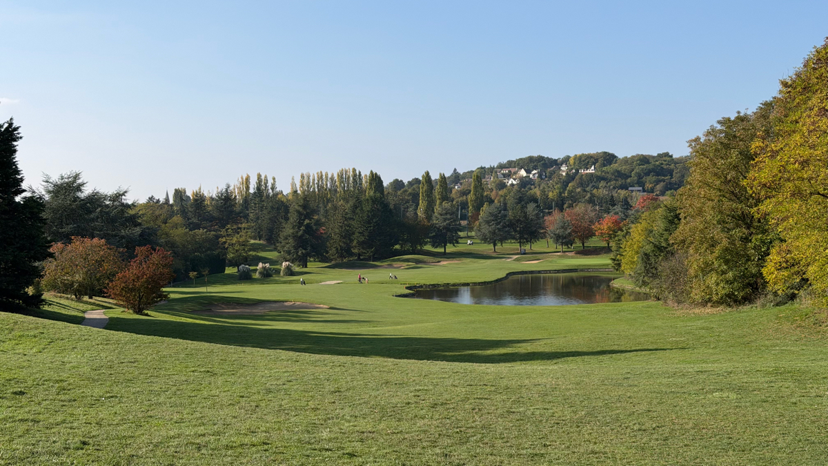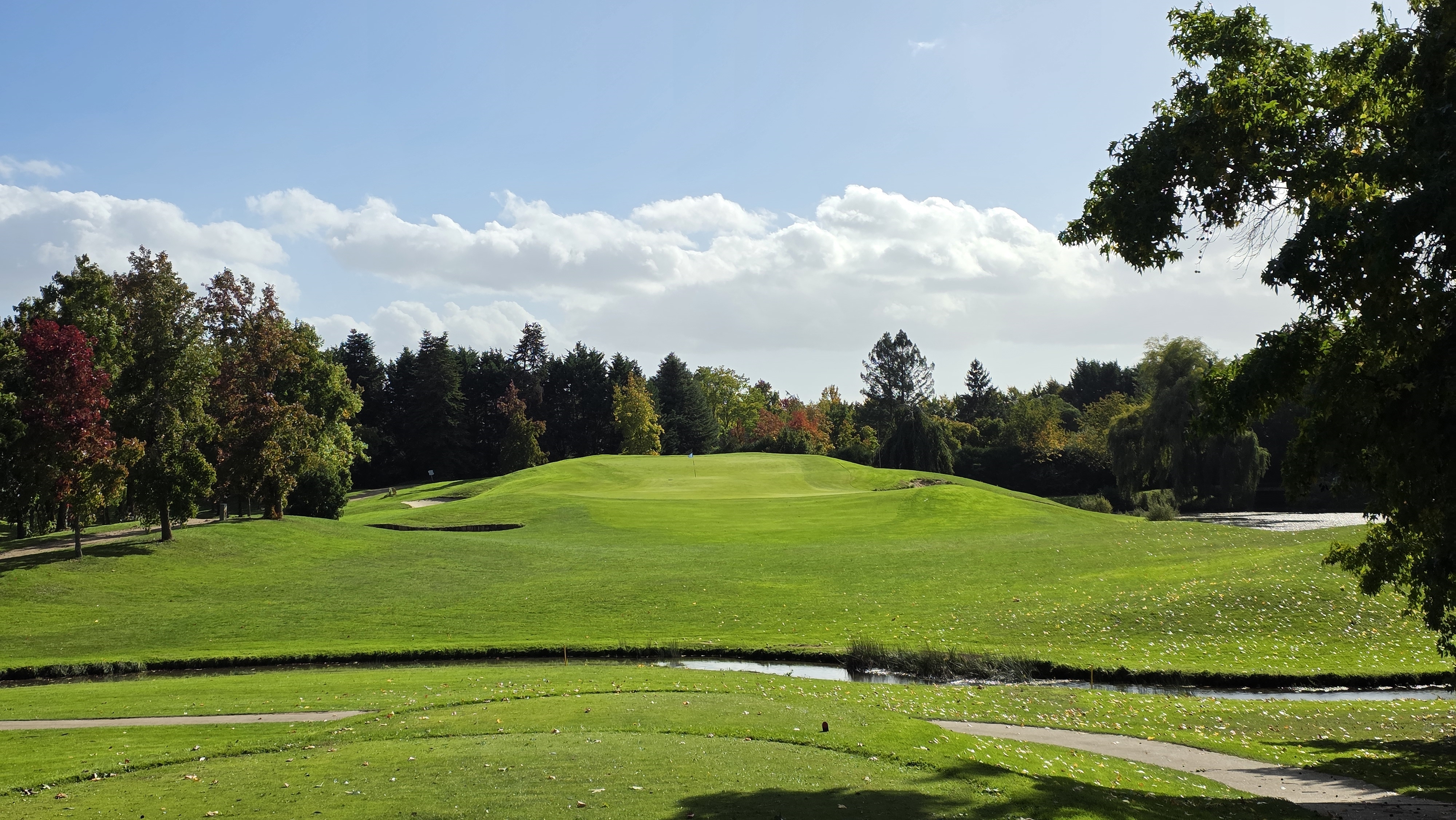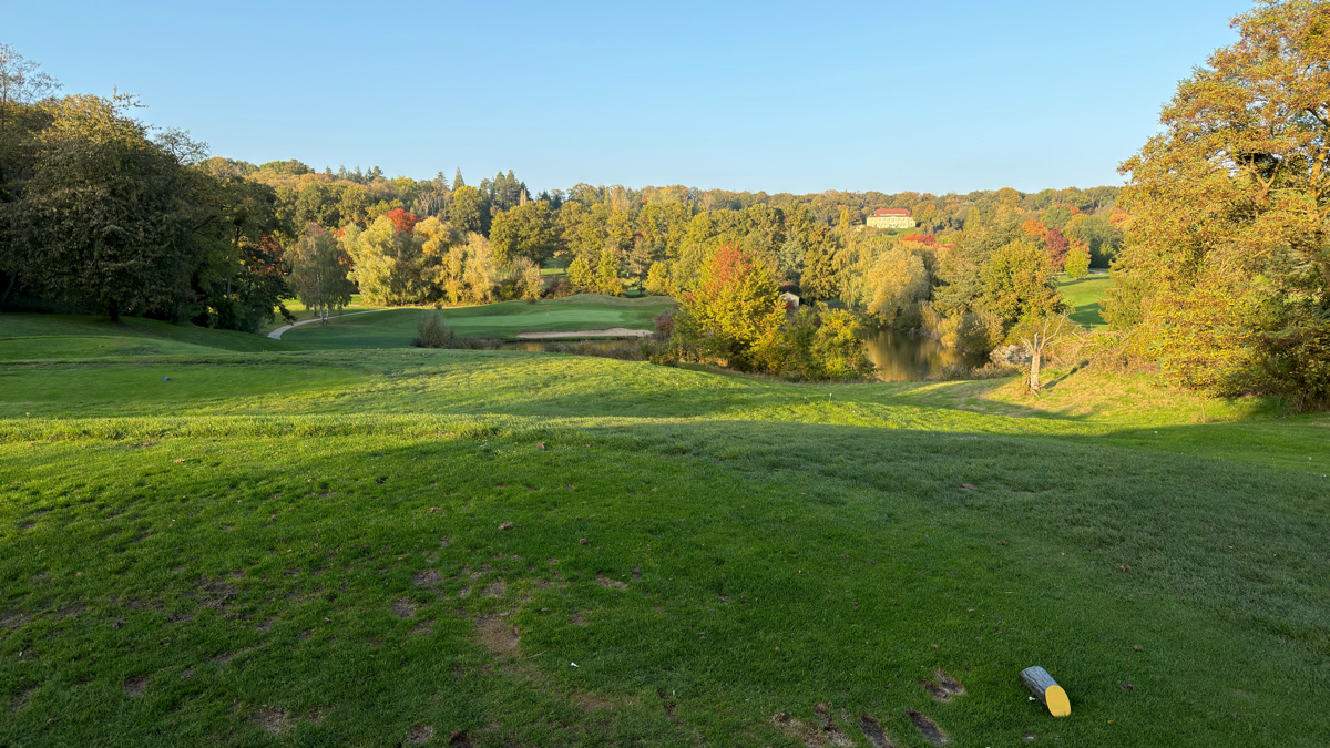 Le départ est à gauche de la photo, fer6/7 bien foireux qui ne décolle pas et fini en contre-bas, après le chemin, au niveau du départ rouge du trou 9 qu'on voit sur la photo.