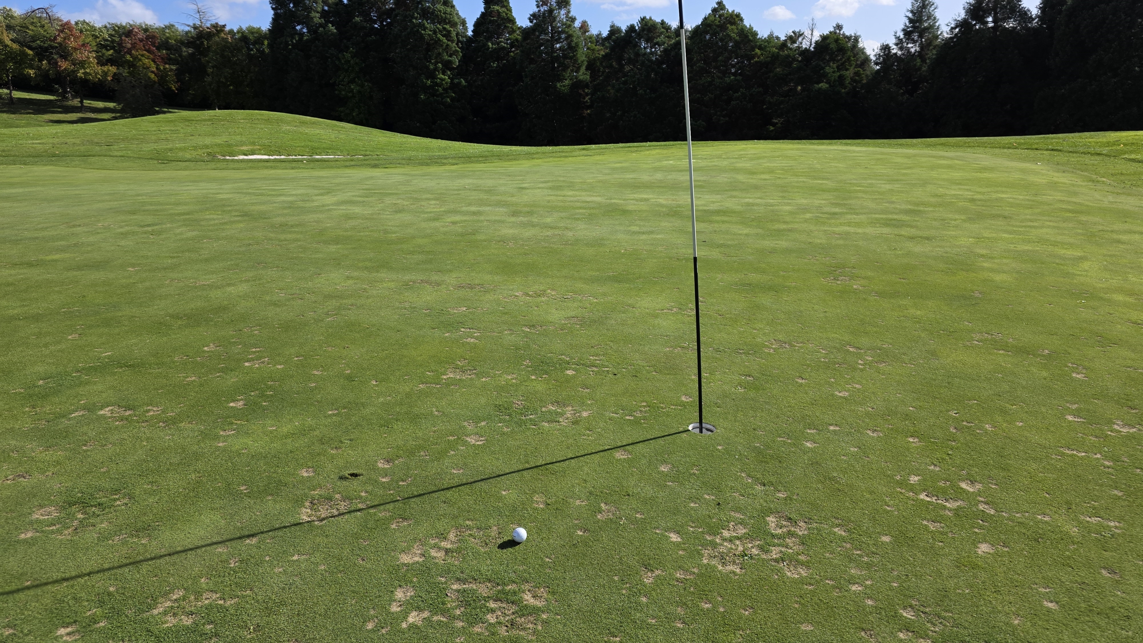 . Le temps que je mets à mesurer puis noter le nom, mes partenaires ont fini mais je n'ai rien vu de la pente. Un des joueurs me dit "droite-gauche, puis ça file énormément après le trou". Donc quasiment le même putt qu'à disney la semaine passée, sauf que la pente est en sens inverse, mais résultat identique, les mains ne tremblent pas, et putt parfaitement exécuté pour un nouveau birdie. Dit comme ça 1,60m c'est pas loin, surtout une vue comme à la télé, mais quand t'es devant la balle avec cette pente, t'es pas pleinement confiant.