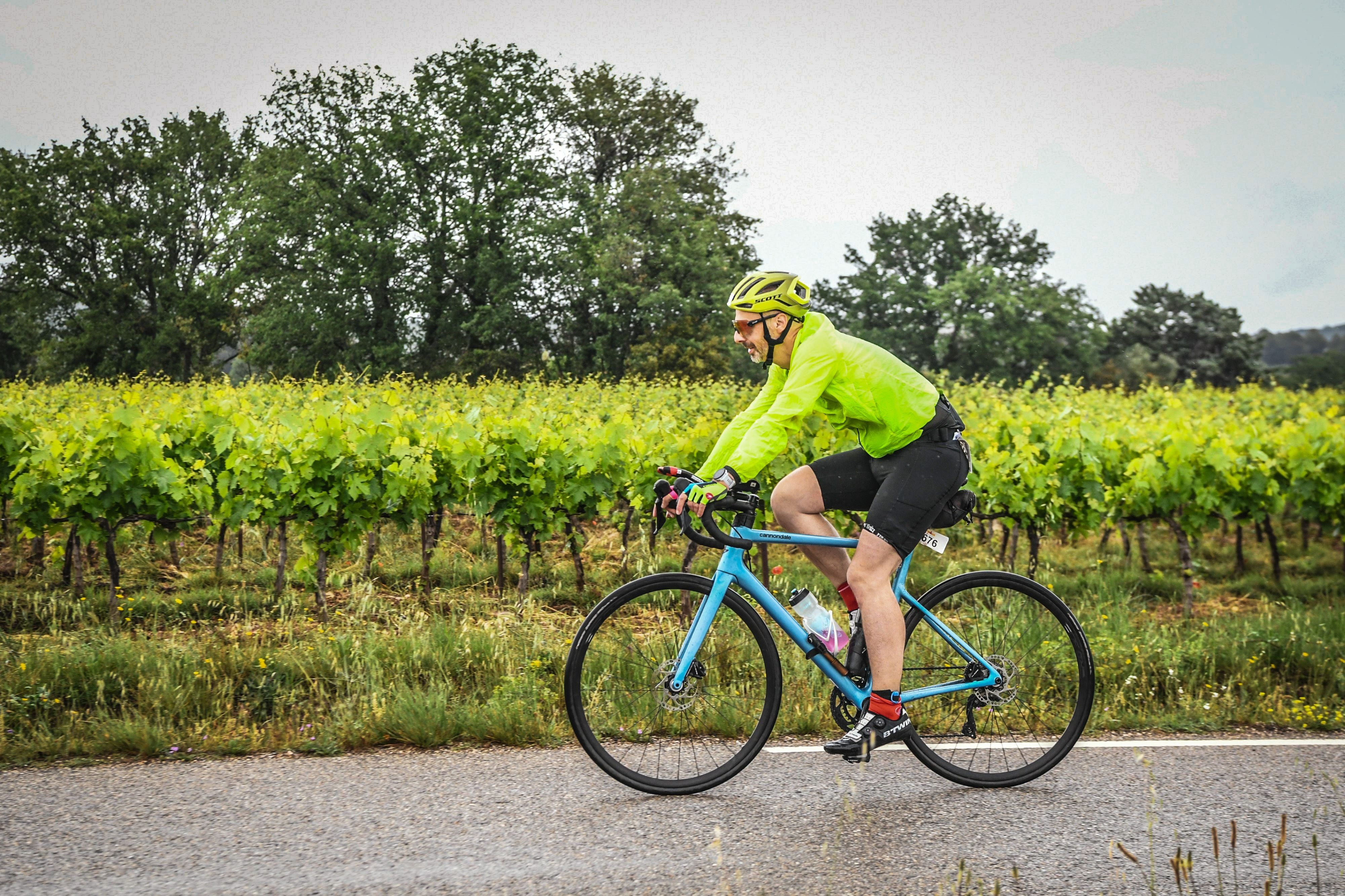 Elle doit faire aisément son 1m85 . Mais manifestement, les dérailleurs, c'est pas son truc. Que ca monte ou descende, toujours sur la plaque petit pignon. Quand ca monte, elle doit tourner les jambes en force à moins de 30 tours minutes, forcément elle avance pas, son corps se gondole n'importe comment, c'est immonde. Sur le plat elle roule bien et me repasse. Cette façon absolument ignoble de rouler me perturbe. D'ailleurs sur le plat, avec les routes détrempées, j'ai du mal à me poser sur les prolongateurs. En plus il y a souvent des changements de revêtements, je préfère finalement abandonner l'idée de me mettre dessus régulièrement. Au bout d'approximativement 1H j'enfourne un gel. Arrive une première bosse qui est indiqué pour 2.4 km. Ca se regroupe à pas mal de concurrents, certains coincent fort. Je ne vois aucun concurrent en danseuse pour relancer. Ca m'interpelle. Par mimétisme je suis le mouvement, histoire de pas me foutre dans le rouge. Bon finalement je dois doubler plus que l'inverse. Ca fait plaisir. Après ca descend bien. A un virage, trois véhicules d'interventions (pompiers, police...) sont présents. Un concurrent sur le bord de la route a l'air hébété, mais entier. Vu qu'il y a plusieurs véhicules, il y a du avoir chute à plusieurs concurrents... Et s'en suit une belle partie plate assez rapide. Il pleut vraiment pas mal, mais n'ayant pas froid, je fous toujours pas le coupe vent. C'est le moment ou je verrais le plus de drafting abusé. C'est aussi un passage ou la route est ouverte à la circulation. Ensuite ca va monter un peu, pas à un gros pourcentage, mais ca monte. Forcément entre les voitures, les concurrents qui ont roulés en paquet de façon abusé, la montée se fait en partie sur un train train pas méchant, tous en file indienne. Vers le 45eme km mes parents avec mes gamines sont présents sur le bord de la route. En bon kéké, je pose une ATTAQUE DE CAUDACIEN et remonte une petite dizaine de concurrents au milieu des voitures devant la famille, en mode souriant