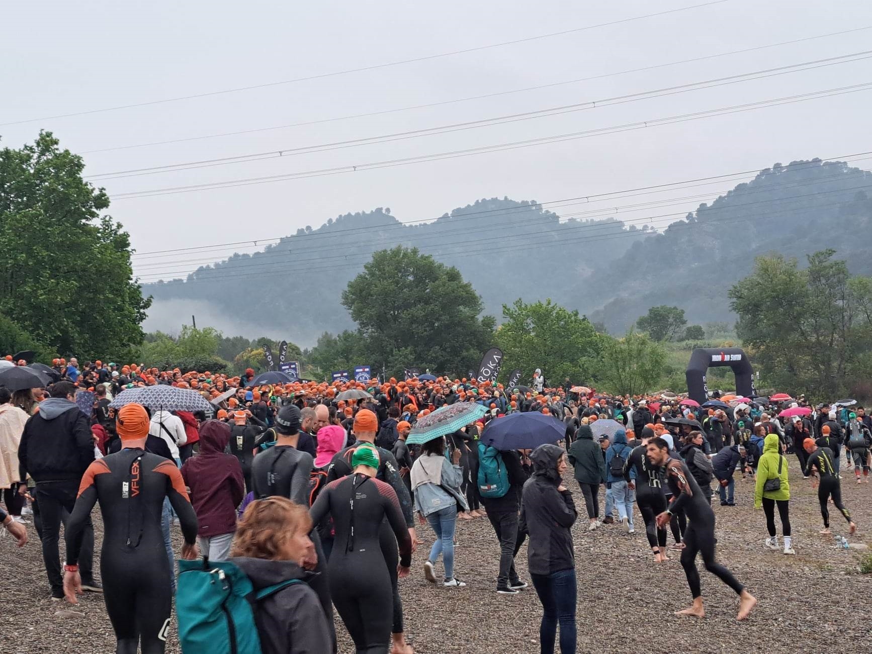 Pour le pneu arrière, j'ai un léger doute sur une fuite. La pression me semble un poil faible alors que j'avais gonflé il y a quelques jours. Dans le doute, je case au fond de la sacoche une troisième CAA. Surtout avec la pluie qui favorise les crevaisons, ca serait bien con de fail à cause de ça. Changement en combinaison, dépôt des affaires, allez direction le départ. Mentalement je suis pas au top, ca me stress vraiment. J'en rate même le positionnement dans les "sas" de temps de natation, finalement je rattrape le sas 41'. Départ des hommes pro. Les gars sont des bateaux. Le premier doit sortir de l'eau en 22', et la première féminine en 23'. On ne fait pas le même sport. Le speaker fait très bien le boulot pour chauffer l'ambiance, c'est sympa. Le moment de mon départ arrive, je suis dans ma file pour le rolling start, c'est parti.