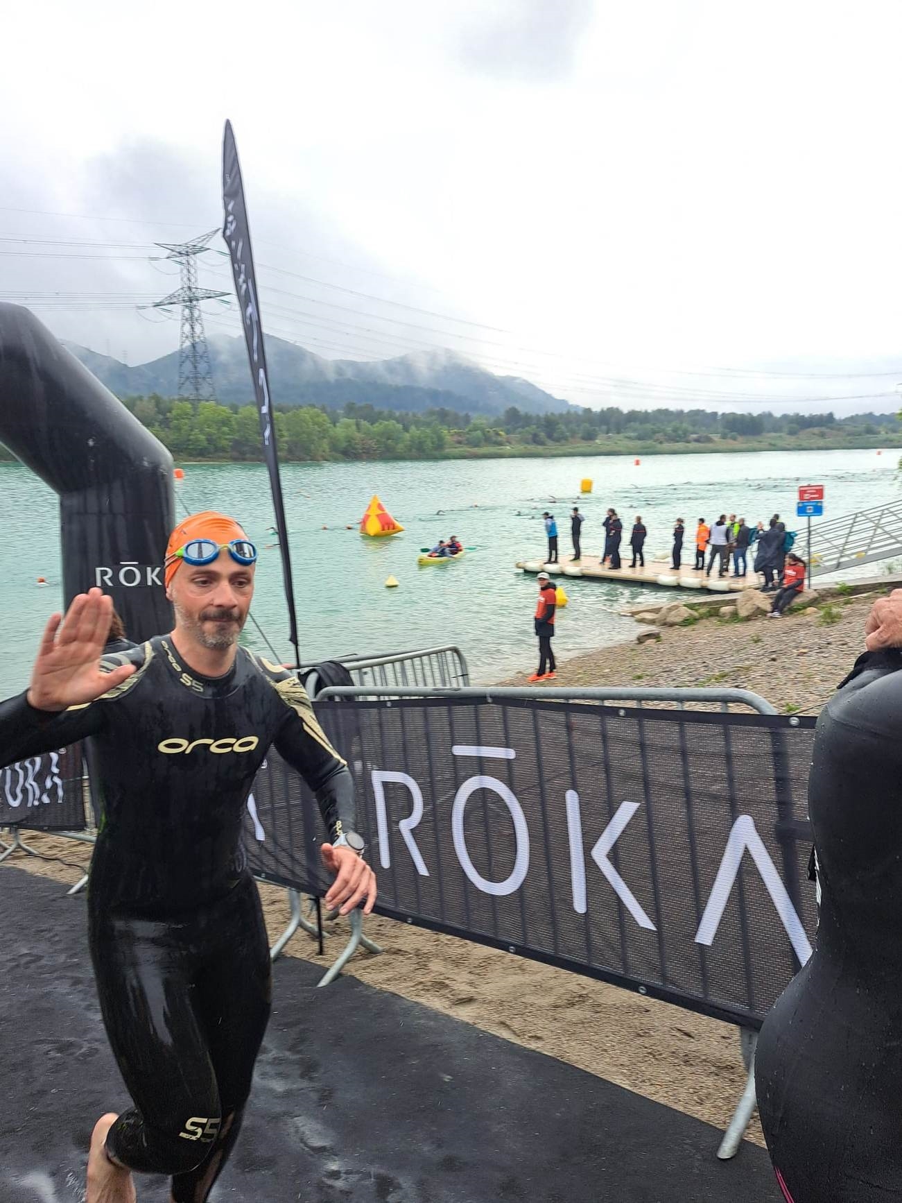 Natation. Grosse panique. Je n'arrive pas à respirer en crawl. Je sais pas pourquoi, comme si je n'arrivais pas à expirer sous l'eau et que je n'arrive pas bien à inspirer. Je dois alterner brasse/crawl pendant 5 minutes et me "forcer" à bien respirer en 2 temps. M'étant fait bien mal à la nuque quelques semaines avant la course (ca serait pas drôle sinon), j'ai bien repris la mobilité, mais j'ai une légère gêne par moment. Une fois bien dans ma respiration, et régulier dans ma nage, ca déroule. Avec le départ rolling start, c'est confort. On se nage pas les uns sur les autres, royal. Les passages de bouées pour le retour se font sans encombre. Sur le retour, je constate qu'énormément de bateaux motorisés de l'organisation se dirigent vers le fond de la natation. Les vagues générés me perturbent (oui je suis nageur de piscine, pas de mer hein