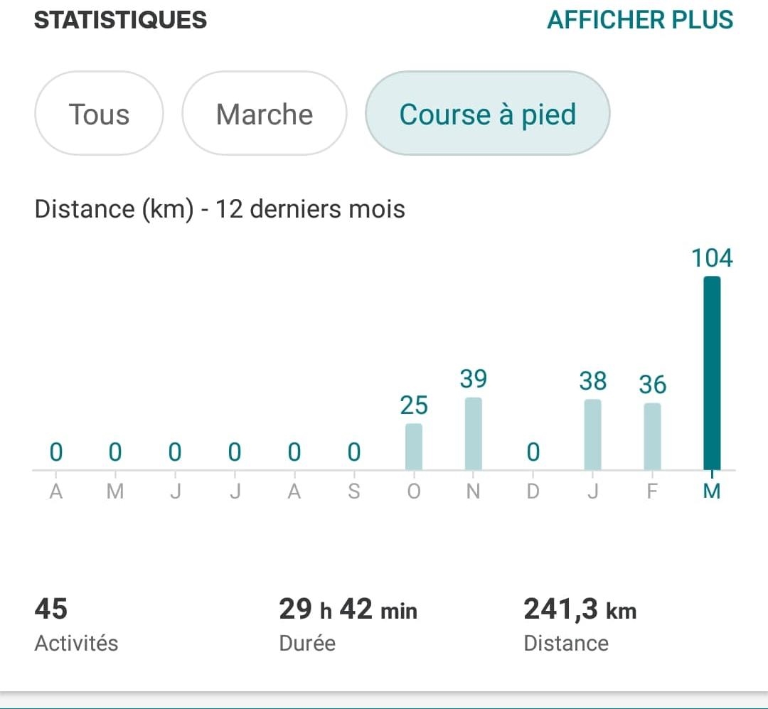 315 jours à 10K perso, cassé par le confinement d'août 2021 (à la Réunion) Message cité 1 fois Message édité par wade le 03-04-2022 à 10:57:33 |