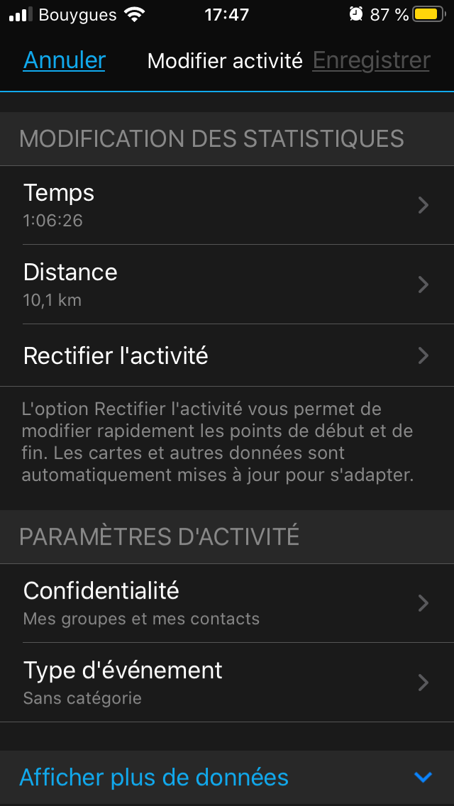 Htan | C'est pas top mais je crois que tu peux modifier/augmenter durée et distance, sans cliquer sur rectifier activité |