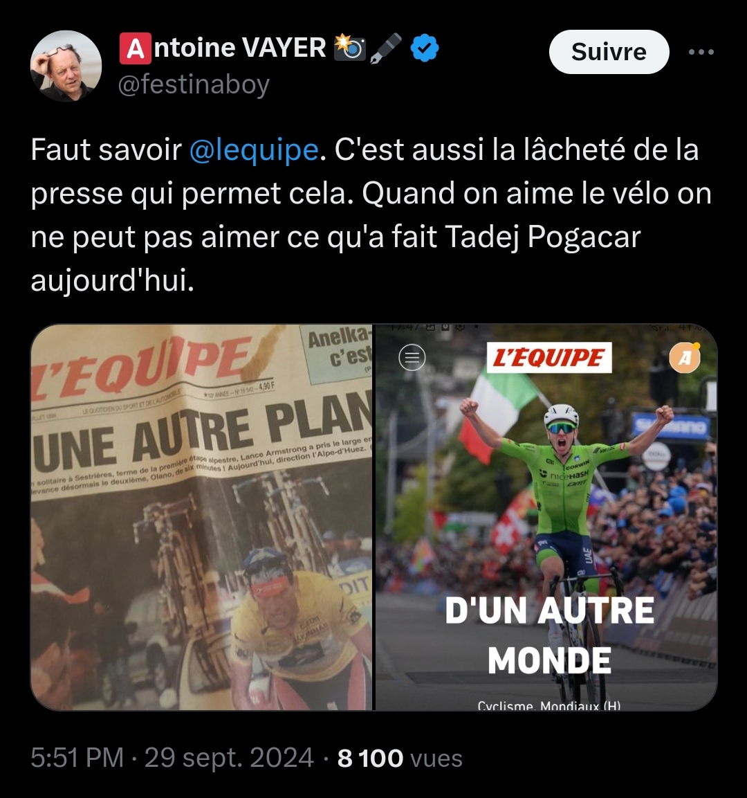 SJM11 | C'est beau la naiveté. Pogacar fait des performances surhumaines tout au long de l'année, et même par rapport aux surdopés des autres époques genre Amstrong. Quant au mythe "il était trop fort les jeunes", je renvoie à cette vidéo par exemple : https://www.youtube.com/watch?v=TwcGtJ_BFBI |