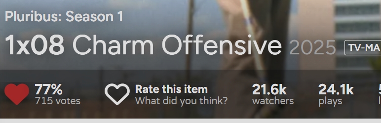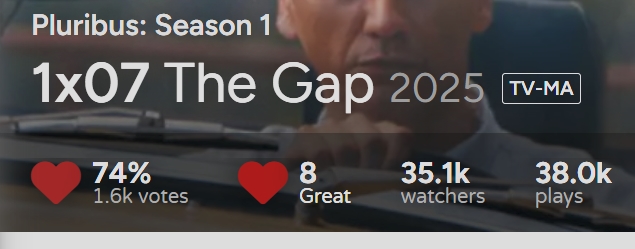 Et j'apprécie Pluribus pour son rythme. Gilligan trolle un peu dans son commentaire sur l'attention des spectateurs mais ça a toujours été comme ça sur les séries du BB universe. Quand le seul commentaire qu'on lit sur la série c'est qu'il ne se passe rien, pour moi on n'est pas le bon public. --------------- Les choses se passent |