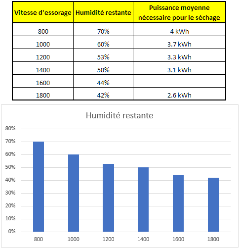 Quand aux 600tr/mn c'est quand même très faible pour un essorage et au contraire je ne suis pas sûr que les tissus apprécie de rester si avec tant d'humidité le temps du séchage. Le rapport entre la vitesse d'essorage et la puissance nécessaire au séchage par la suite, récupéré sur un site anglais dont il faut que je retrouve la source et d'info sur Les Numériques :