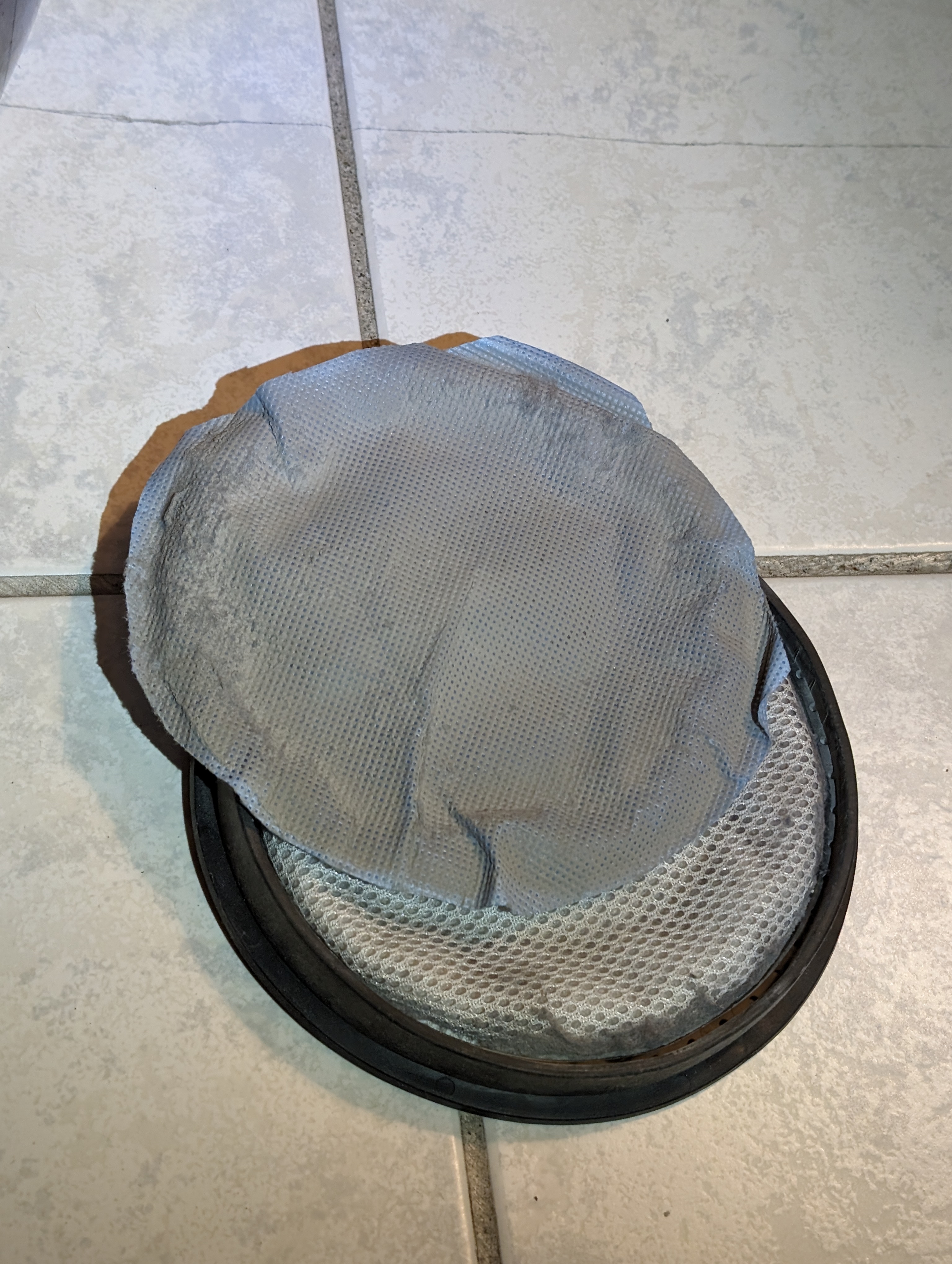 Le principal problème c'est le gros filtre avant moteur sensé capturer la poussière, qui en capture beaucoup trop. Le filtre est lavable, mais même en le passant sous l'eau chaque fois que je vide le bac, je sens encore la poussière éjecté par l'aspirateur (malgré le filtre hepa en sortie). J'ai fini par découper un morceau de sac aspirateur que je mets devant ce filtre, et voici la photo après un premier remplissage du bac : C'est un peu plus respirable en sortie, mais on sent toujours la poussière. Bonus conception pétée : l'air est éjectée vers l'avant, donc vers la personne qui manipule l'aspirateur Aspirateur globalement bien noté par les numériques qui ne voit pas le problème.