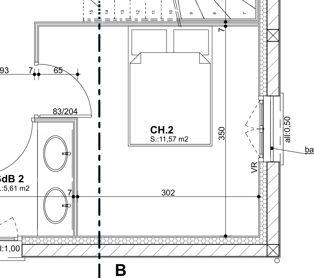 Je me demandais justement si c'était judicieux de faire sauter ce petit muret qui délimite l'entrée et sert juste à adosser leur canapé. Sur les plans de la maison il n'existe pas. |