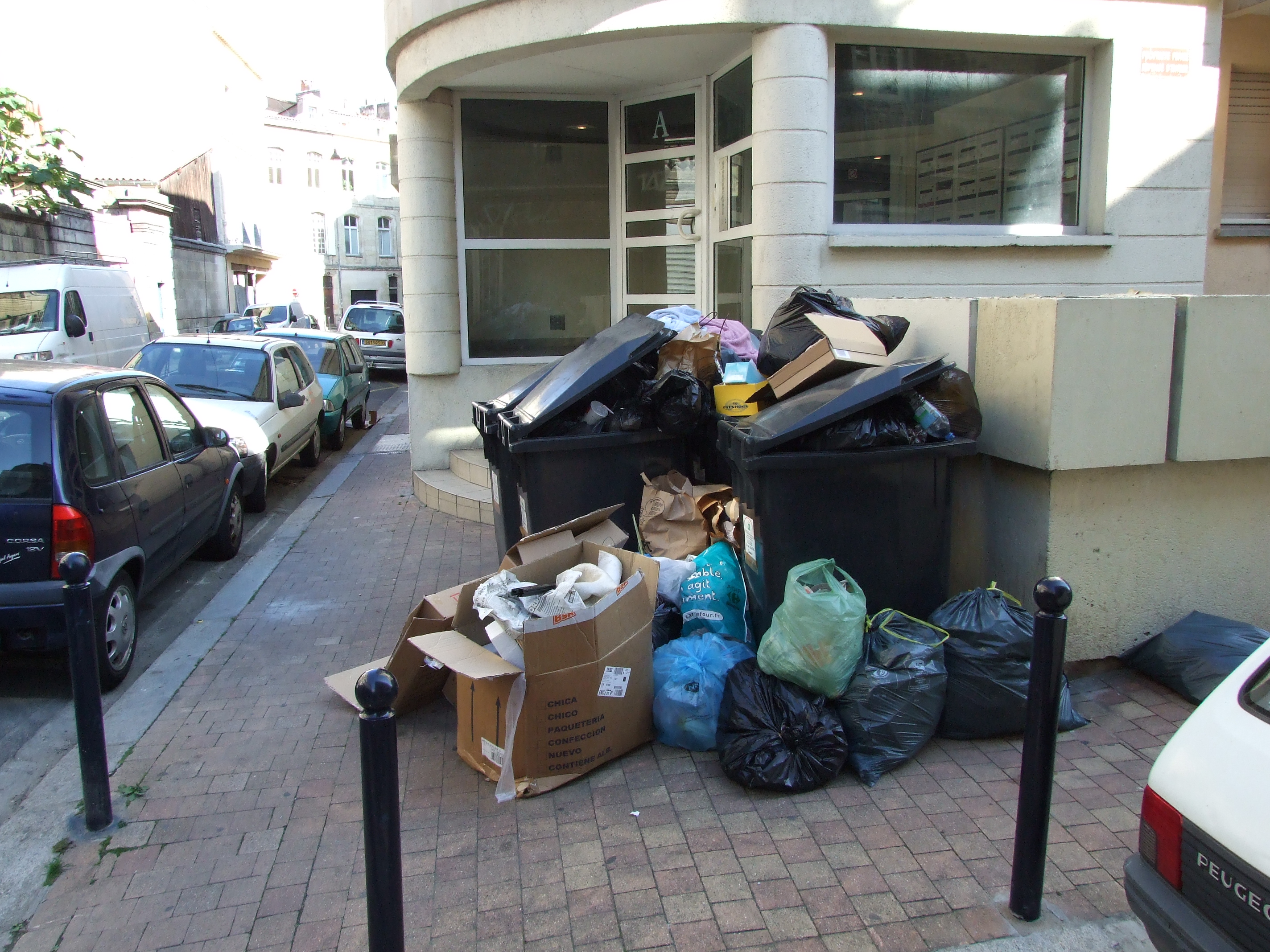 En fait, jusqu'à Juin, y'avait pas du tout de poubelles dans l'immeuble, mais sur le bord du trottoir en face de l'entrée (à peu près à la place de la voiture blanche à gauche sur la photo de gauche) y'avait 4 immenses bac, qui prenaient l'emplacement d'une voiture. Et y'avais ça un peu partout dans St Michel. Mais en Juin, ces bacs ont été retirés, et des bacs plus petits (cf. photo) ont été livrés dans les immeubles. Au début, aucune info, les gens ont amassé leurs poubelles devant l'entrée, moi j'suis allé fouiller au sous sol et j'ai trouvé les bacs... dans le parking en vrac |