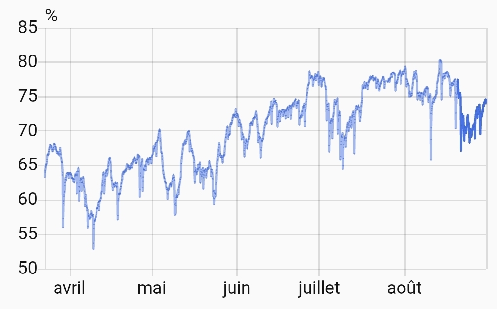 Ce qui n'était pas le cas y'a un an quand on a emménagé. Alors on le dit que l'été, paradoxalement c'est plus humide et que l'hiver je vais retrouvé mon taux d'humidité de 60% J'ai l'historique que depuis mars :