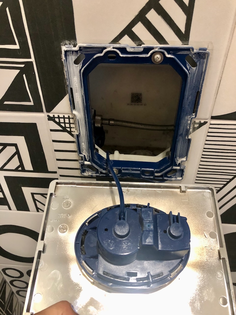 Merci, j'ai une autre piste ! Ce n'est pas le branchement qui est fautif (Se raccorde par un seul capillaire à l'arrière de la commande) mais peut-être simplement que la petite chasse relâche 4.5L (vs 6L pour une chasse) et que la différence n'est pas très perceptible. Je crois qu'on peut régler le volume de la petite chasse à 3L (et celui de la chasse à 9L) : https://www.grohe-x.com/fr-fr/acade [...] ush-volume |