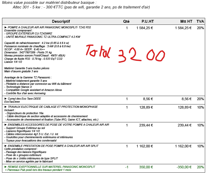 Salut, Grosso modo, si l'installation est simple, je suis à 2800€. Donc a voir si: Après, t'es dans quelle région ? Moi hors grande ville et pas mal d'artisans dans mon coin, donc je serais forcément un peu moins cher qu'en grande ville. Alternativement, si tu es bon bricoleur et que tu es équipé en matos de bricoleur, tu peux faire toi-même et économiser pas mal. Attention, mise en service à faire à un pro certifié (200/250€ pour le monosplit). A voir si tu as besoin d'un échafaudage ou perfo SDS max avec le bon forêt ou carotteuse. 1 semaine, c'est largement assez à moins de ne pas savoir bricoler. Après, si tu n'y connais rien en clim, tu risques de galérer aussi. La premiere fois, chez moi pour me faire la main, j'ai fait de la merde et c'est normal. Gainable -> pas d'avis, je fais rarement, trop de facteurs pouvant influencer le prix. Message cité 1 fois Message édité par Hector Stringer le 02-07-2025 à 22:35:01 --------------- ça restait très stylisé, la tête parlait encore. |