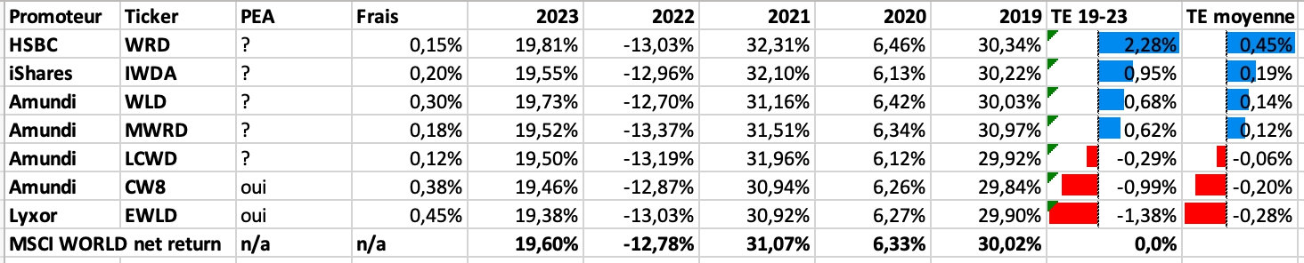 En toute honnêteté, j'avais une colonne TE dans mon fichier par le passé, mais je l'ai viré car elle ne sert pas l'intérêt du tableau. Avec une colonne TE, les gens vont croire qu'il faut absolument prendre l'ETF avec la plus faible TE. Sauf que c'est comme les frais : l'ETF avec la plus faible TE change chaque année. Donc ça ne devrait pas être un élément de choix. La TE passée ne préjuge pas de la TE future. Et attention à ta dernière colonne, tu fais une moyenne de pourcentage, ce qui n'a aucun sens mathématique. Message cité 1 fois Message édité par kimmeria le 29-02-2024 à 12:30:07 |