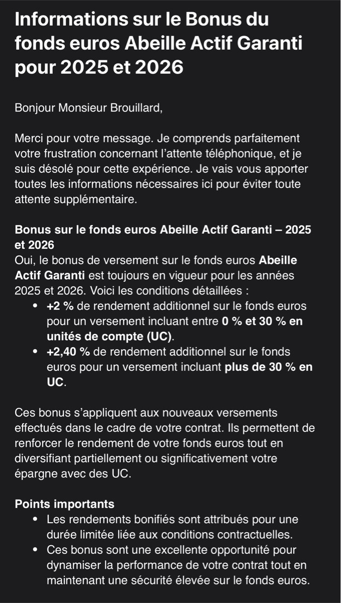 EDIT : voilà le message sur Abeille (contrat evolution vie avec fond Abeille garanti) Mais rien de plus Message cité 2 fois Message édité par david42fr le 16-01-2025 à 19:55:01 --------------- A life spent making mistakes is not only more honorable, but more useful than a life spent doing nothing. -- Shaw -- mon topic de vente photo |