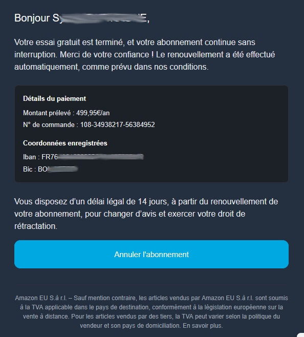 _Jo_306 | Dans tous les cas c'est un phising : Amazon Prime ça coûte pas 500 balles par an Edit : grillé, mais je rajouterais aussi que si c'était vrai jamais un organisme balance ton rib comme ça dans un mail. Ils le connaissent déjà, aucun intérêt d'aller te le redonner (au pire juste la fin, comme une CB) donc c'est là encore une technique pour faire peur Message cité 1 fois Message édité par _Jo_306 le 17-06-2025 à 10:11:05 |