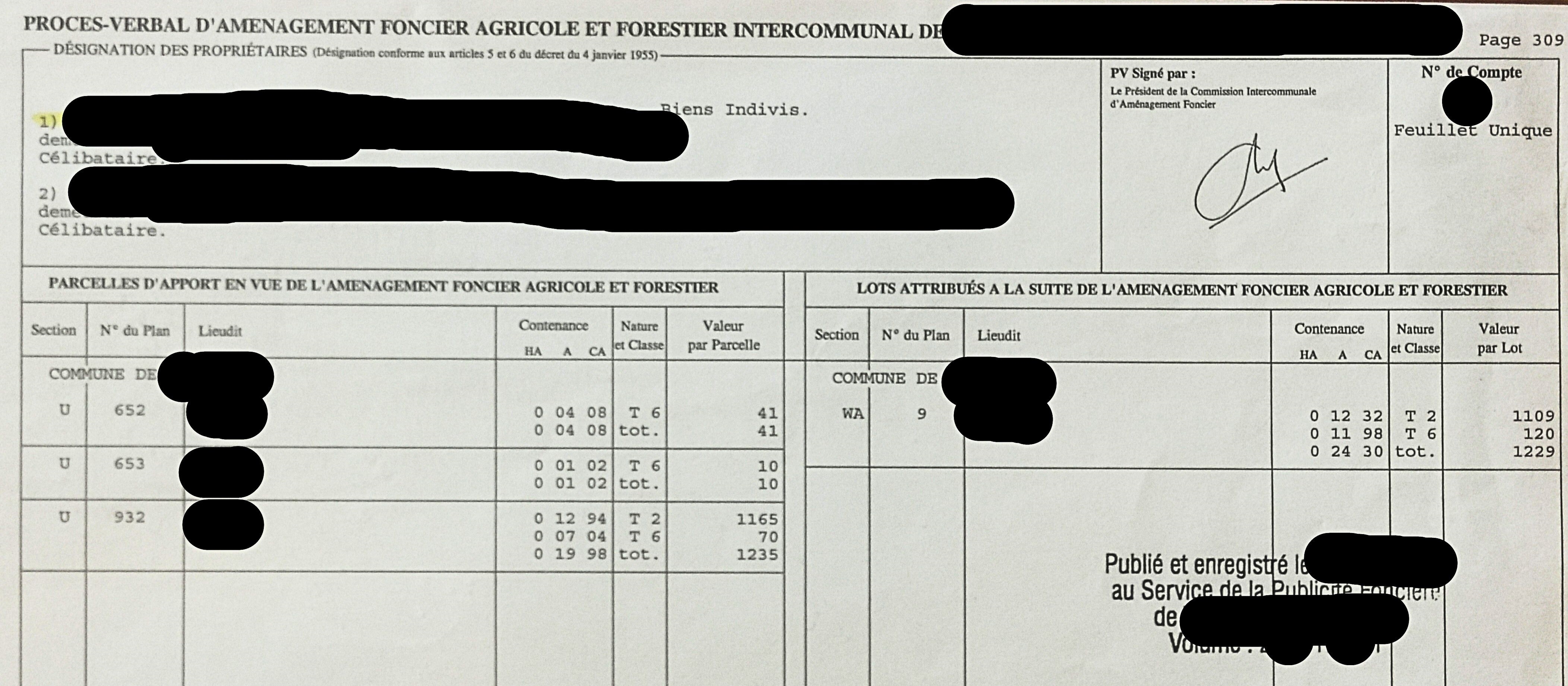 A mon avis la parcelle ne t'as pas été "attribuée" lors du remembrement. Cette partie de la nouvelle parcelle 10 est toujours commune. Après oui il y a sans doute une démarche à faire pour clarifier la situation auprès de l'administration fiscale pour savoir qui est redevable de quoi. Vu que ce n'est pas vraiment un terrain à bâtir, tu ne dois pas pouvoir créer un lot distinct. Tu pourrais peut être réfléchir l'acquérir moyennant la création d'une servitude concédée au fonds 10 pour garantir l'accès et le droit au stationnement d'un véhicule ? Consulte le notaire qui a instrumenté les différentes ventes la dessus. Message cité 1 fois Message édité par belisarios le 05-03-2026 à 11:07:16 |