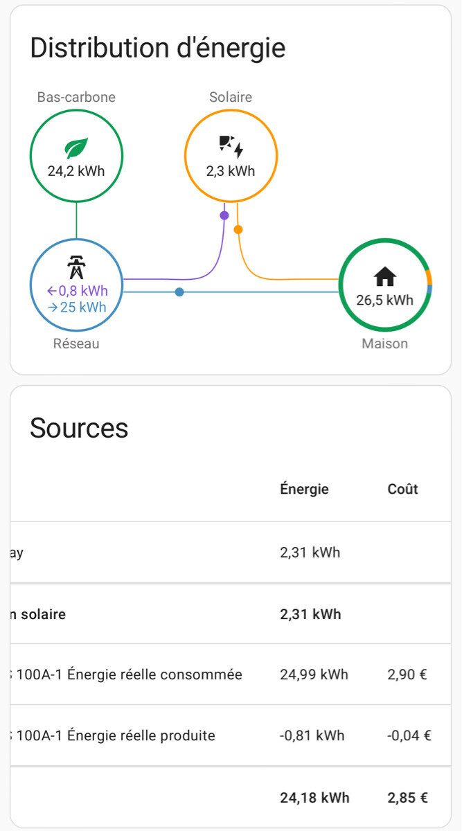 Les valeurs de production et d'export sont justes (à quelques wH près) MAIS la conso total "maison" correspond à l'import du réseau + la prod solaire Je ne vois pas du tout comment modifier... j'ai installé HA il y a quelques semaines, j'ai encore beaucoup à découvrir...