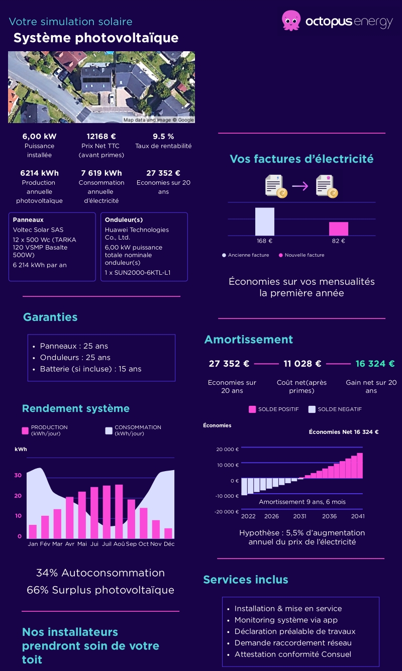 rody | Bonsoir les copains Je suis en train de prendre des renseignements pour du PV pour mes parents. Maison qui à 12 ans (250m² avec piscine intérieure J'ai eu une première propal de Beem pour 6Kwc en toiture avec ou sans option batterie de 6.6 Kwh 16.8k€ avec batterie et 11.7k€ sans batterie. L'installation serait sur un toit tradi (45°) avec la pente orientée EST à Guérande (44). Les panneaux recevront tout de même du soleil du Sud mais forcement c'est moins opti. Matériel : 6.1K€ - Panneaux : DMEGC DM500M10RT-B60HBT (x12) Si Batterie +5K€ environ et garantie 15 ans (Onduleur intégré au système batterie donc j'ai pas la référence). MO : 4.8K€ Prime autoconso estimée : un peu moins de 1k€ Voici ce que calcule Beem pour la rentabilité même si je comprend pas trop que l'autoconso soit si élevée sans batterie. (basée sur une moyenne et sur la conso de 19Mwh) Rentabilité sans batterie : Production PV : 6320 kWh Autoconsommation : 87% Autonomie énergétique : 29% Economie la 1ere année : 1488€ Economies moy. sur 20 ans 2052 € / an Économies totales sur 20 ans. : 41031€ Rentabilité : 7 ans Rentabilité avec batterie : Production PV : 6320 kWh Autoconsommation : 100% Autonomie énergétique : 33% Economie la 1ere année : 1590€ Economies moy. sur 20 ans : 2244 € / an Économies totales sur 20 ans : 44876€ Rentabilité : 9 ans Vous en pensez quoi sachant que mes parents veulent pas se faire chier et souhaite faire faire ? Merci beaucoup Message cité 1 fois Message édité par rody le 13-11-2024 à 20:55:54 --------------- Mon feed ici Origin : Urbain_Lambert |