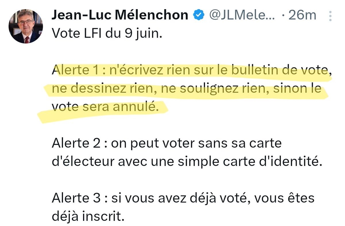 Panique totale chez LFI : grosse campagne de communication en cours pour que leurs électeurs n'inscrivent pas free palestine ou ne dessinent pas de drapeau sur leurs bulletins de vote.