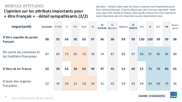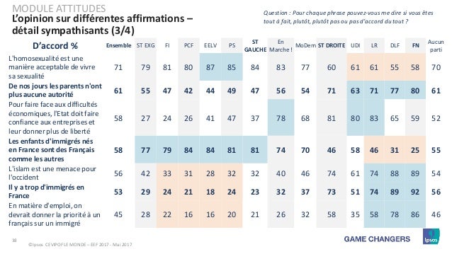 Dommage que le détail des chiffres soit pas dispo, parce qu'il est en plus assez facile de pas mal manipuler les sondages en regroupant des réponses de cette manière ... Par contre dans un autre PDF dispo sur la source originale ( http://www.ipsos.fr/sites/default/ [...] _monde.pdf, slide 36), il y a au moins la répartition sur tous les sondés entre tout à fait d'accord / plutot d'accord / ni en accord ni en désaccord / plutot pas d'accord / pas du tout d'accord : 43 / 28 / 22 / 4 / 3 Ce qui accrédite surement ta remarque (par contre j'ai du mal à comprendre comment on peut être "ni pour ni contre, bien au contraire" sur une affirmation aussi molle que "L'homosexualité est une manière acceptable de vivre sa sexualité" Message édité par Juju_Zero le 19-06-2017 à 13:12:39 --------------- iRacing, LA simu automobile |