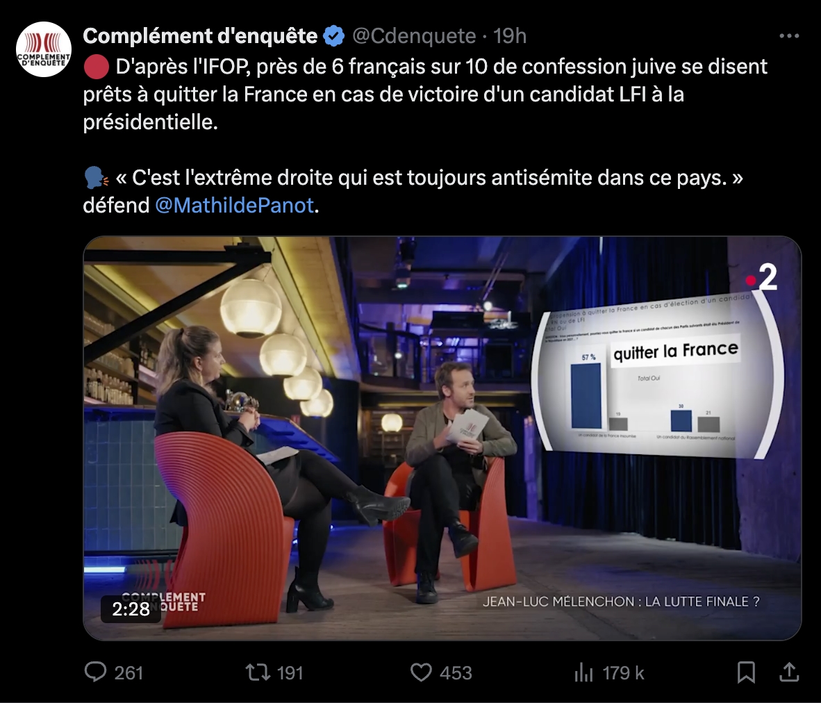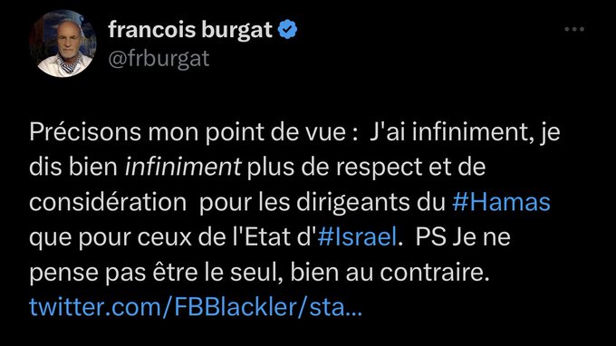 L'extrait de Mélenchon d'il y a quelques années qui dit qu'il faut pas importer les conflits en france, que c'est la seine et pas le jourdain ici. Je ne le conaissais pas celui-là, il est priceless, il faut le ressortir chaque fois que le SAV nous explique que c'est la préoccupation de LFI depuis toujours.