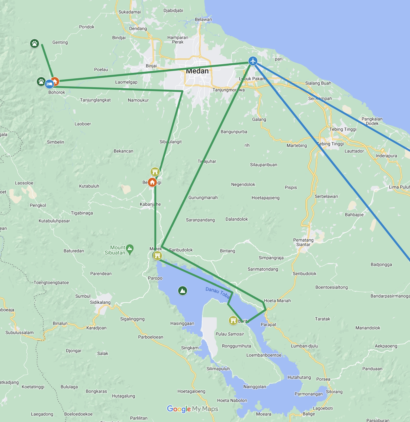 En soirée, on passe un peu de temps dans le terminal international pour grignoter rapidement dans un des nombreux restaurants J02 - Sumatra - Bukit Lawang Arrivés à Medan, un chauffeur affrété par notre "agence" nous attend, et c'est parti pour près de 4h de petites routes direction l'Ouest pour rejoindre les abords du parc naturel de Gn. Leuser. Le village de Bukit Lawang est en bordure de la jungle, de l'autre coté de la rivière. Le Lodge dispose aussi d'une zone de repos avec un bâtiment à la forme très spéciale, qui reprend l'architecture des bâtiments traditionnels de la tribu Batak Il fait trèèèèès humide, le bruit des nombreux insectes est omniprésent, et on entend régulièrement des hurlements de singes... En soirée, on rencontre l'organisateur avec lequel on a peaufiné ce trip, ainsi que le guide qui nous accompagnera pendant notre périple. J03 - Sumatra - Route vers Tangkahan On aperçoit une usine de traitement le long de la piste Arrivée dans le village de Tangkahan après 2h de route, pour 15Km à vol d'oiseau Nous prenons un petit encas dans une sorte de restaurant qui surplombe la rivière,