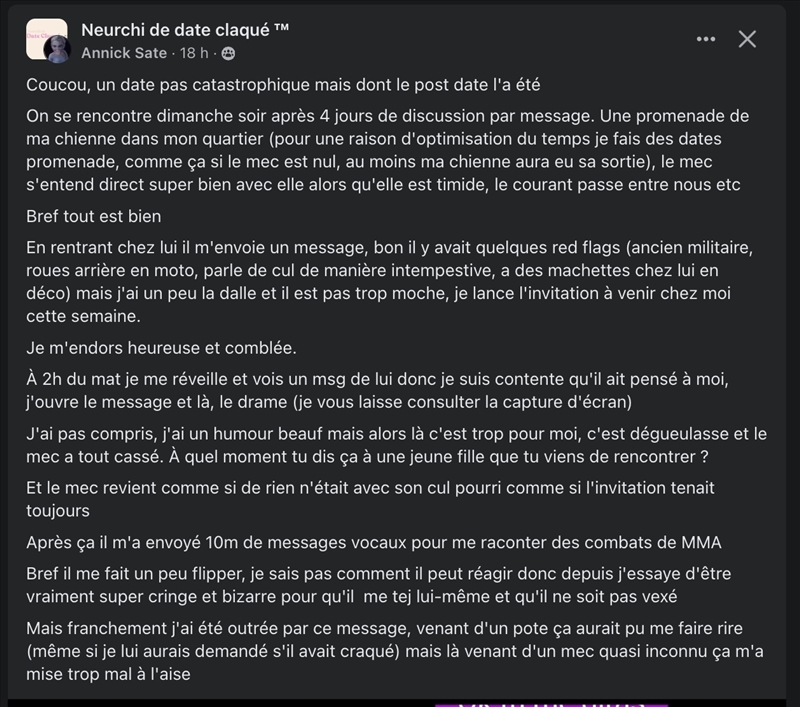 Elle m'a pas stalké, nain jaune pour rappel. J'avais envoyé un mail à la boîte mail générique de la pharmacie en demandant si je pouvais avoir le numéro de la pharmacienne qui m'avait servi (mec avec la rage de dents vers 13h) --------------- "Notre équipe est championne du monde d'oeno étudiante devant oxford, harvard yale et les plus grosses univ asiatiques. Je pense que ça te permet de comprendre un tantinet notre professionnalisme." - Wartod |