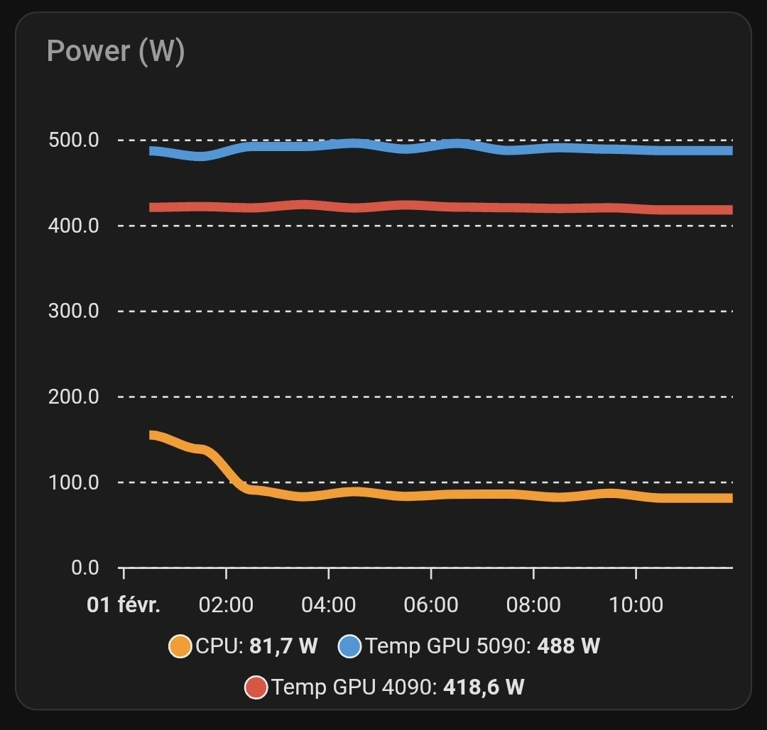 azubal | J'avais 7 4090 qui tournaient a balle H24 et jamais eu de soucis. Voici la conso de ma 4090 et 5090 (PF 90%). |