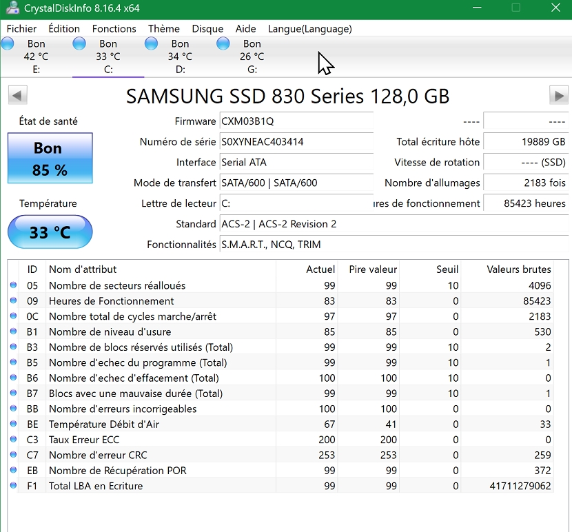 TotalRecall Modérateur | Ouais il a l'air correct ce SMART. Pas besoin de dommage physique pour corrompre les données en cas de coupure de courant, surtout si le disque est en pleine écriture à ce moment là.