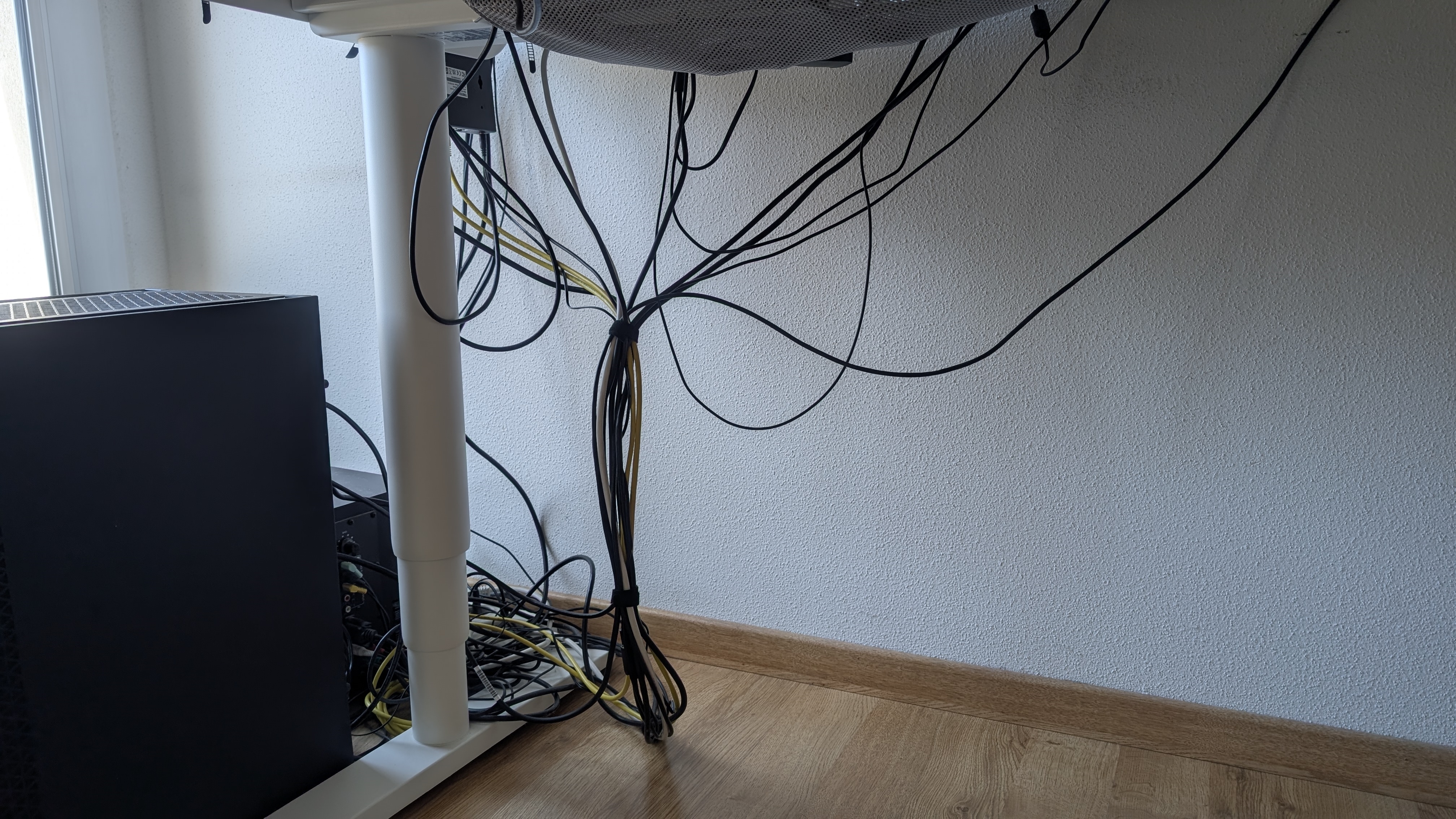 Tu peux acheter une gaine câbles pour tous les rassembler, et en collant des aimants dessus, tu peux la faire "disparaitre" derrière ton pied de bureau.