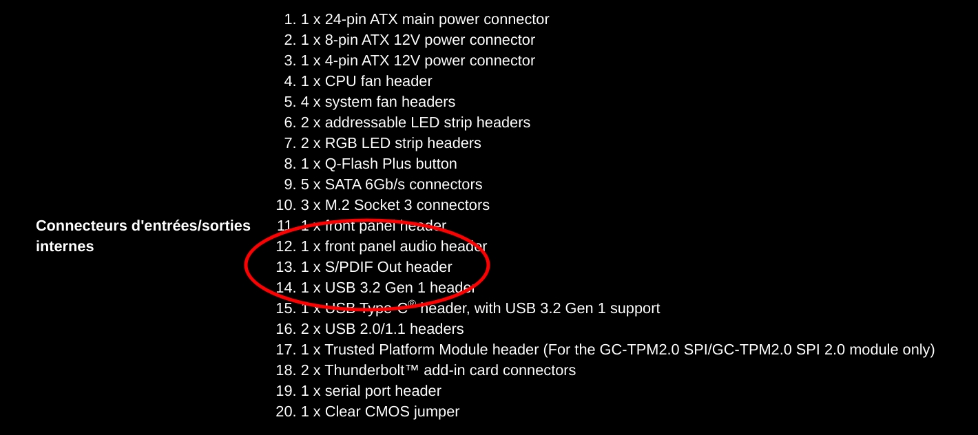 Tartifless | Donc soit c'est la sortie line out qui peut faire analogique ou numérique, soit quand ils disent support for spdif out ça veut dire depuis le connecteur hdaudio interne ... |