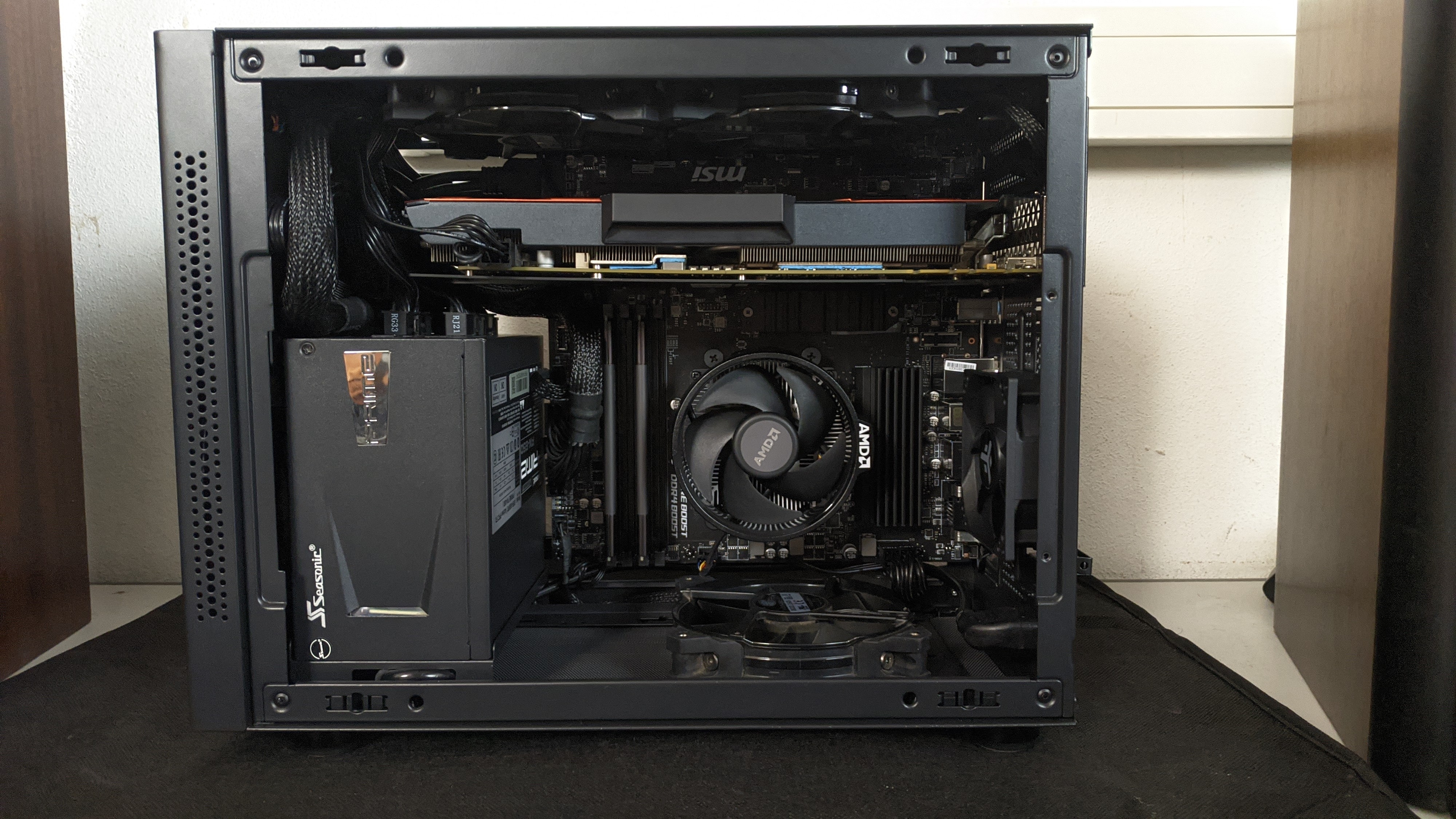 Le cable management est pas dingue, notamment entre les plaques car on a vite fait de les faire bomber (un câble d'alim' plat touche déjà). Avec une alim' SFX ça aurait été beaucoup plus simple.