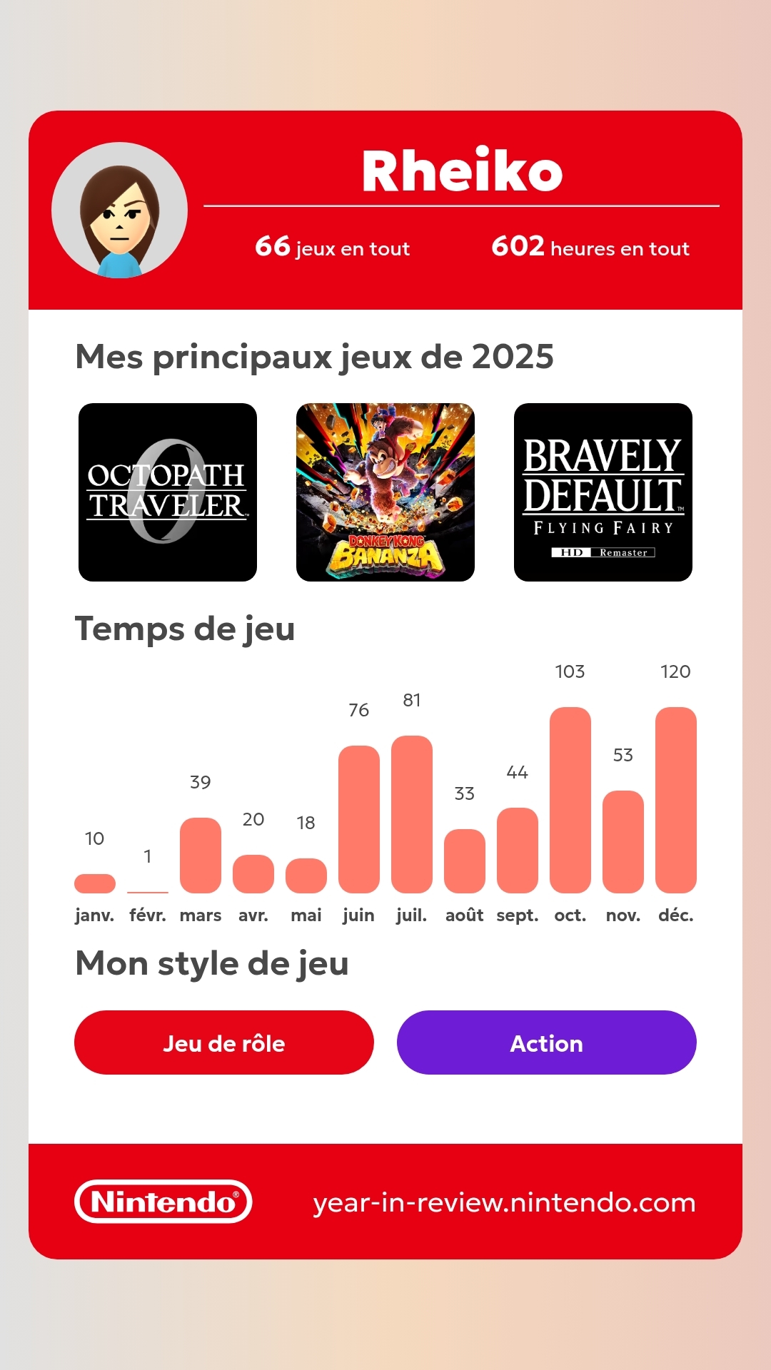 ça dépend si ton bilan total coche tous les cases comme moi sinon bilan 2025 : 393h, Xeno, MKW et DK Message cité 1 fois Message édité par kyouray le 13-01-2026 à 23:14:55 --------------- UNICORN OVERLORD | Japanese game developer translations (not mine :o) |
