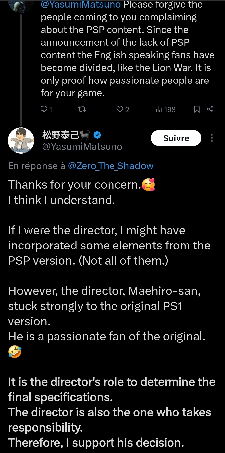 Yasumi Matsuno, très actif sur twitter l'a aussi confirmé : Message édité par Ekid le 18-06-2025 à 16:40:52 |