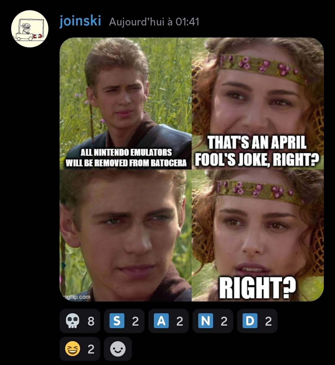 dje33 Transactions (0) | Cela me fait marrer. Au début j'y ai cru puis je me suis dis que c'était un poisson. Cosmo y a cru plus longtemps mais c'est le but du poisson d'avril. Les gens doivent se détendre un peu. C'est un projet gratuit, s'ils décident de ne plus proposer les émulateurs Nintendo, tu as juste à aller chez recalbox ou forker une version où il y a encore les emu Nintendo. Même pour yuzu qui est fermé tu arrives a trouver facilement des versions fonctionnelles. |
