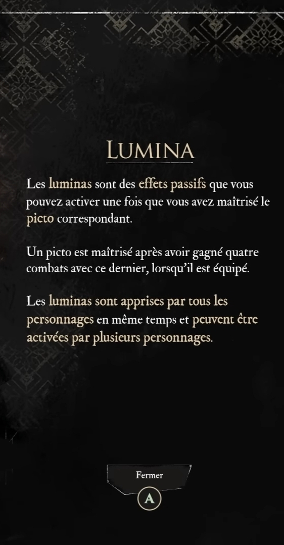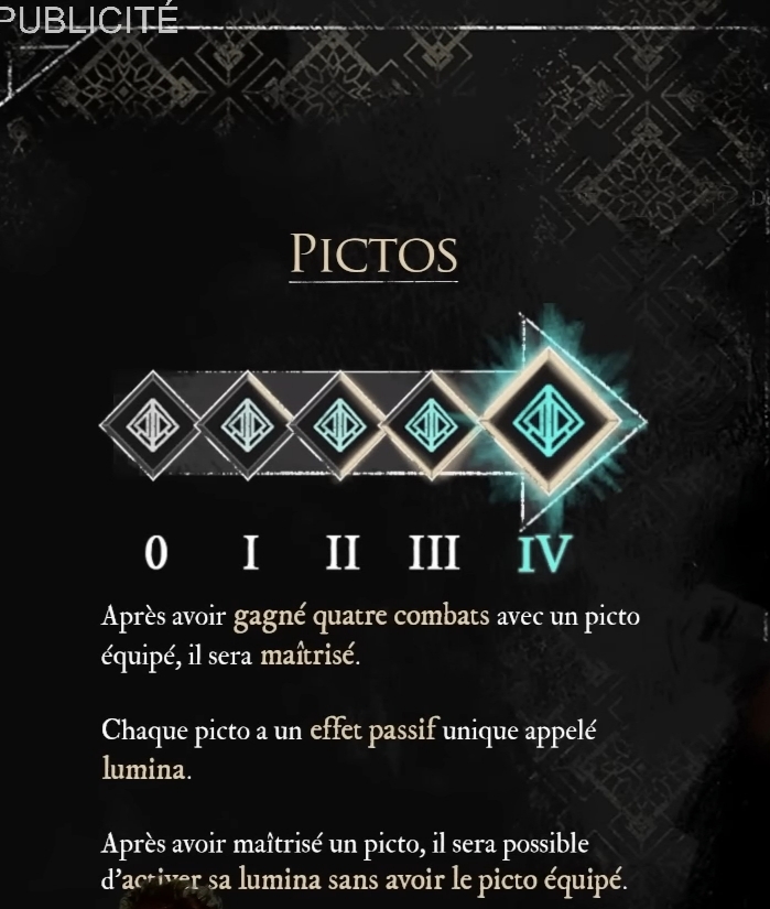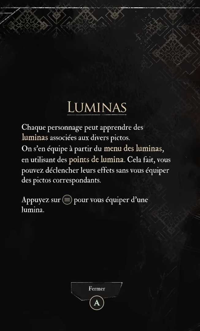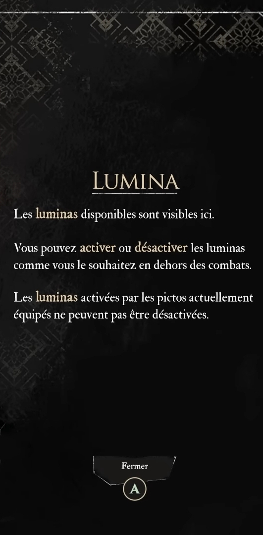 Taiche (╯°□°)╯︵ ┻━┻Transactions (0) | Les points de lumina viennent avec le niveau (1 par niveau) + l'utilisation des lumicolors auprès du conservateur. Chaque picto maîtrisé (= lumina) coûte un certain nombre de points de lumina pour pouvoir être équipé. Message cité 1 fois Message édité par Taiche le 31-12-2025 à 19:03:36 --------------- Everyone thinks of changing the world, but no one thinks of changing himself | It is the peculiar quality of a fool to perceive the faults of others and to forget his own | Early clumsiness is not a verdict, it’s an essential ingredient. |