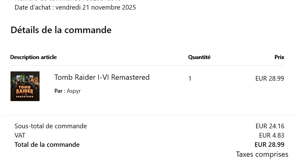 DiB91 BwaaaaaaahTransactions (5) | Y a aussi la double-compilation des Tomb Raider Remastered qui est en promo. Message édité par DiB91 le 21-11-2025 à 11:48:27 --------------- La DiBerie | Rehost | Link |